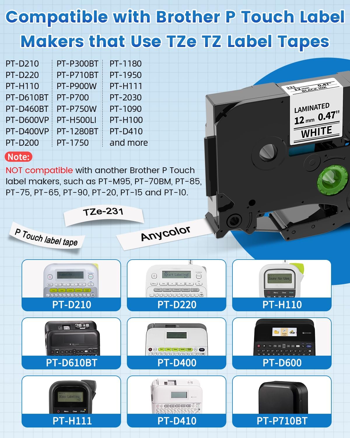 - Long-lasting TZe TZ Tape 12mm 0.47 Laminated Color Label Maker Tape: Anycolor compatible with Brother label maker tape is printed by thermal transfer printing, and makes the text printing below the laminated film for better protection. So the replace for Brother P Touch label tape is durable and can withstand water, fade, abrasion and temperature. Great for both indoor and outdoor use