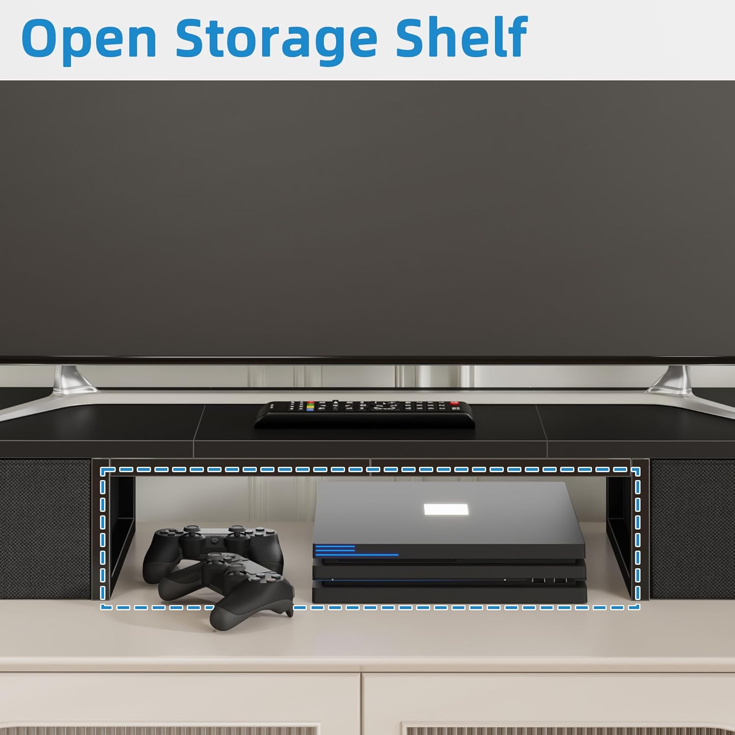- γMiddle Open Storage SpaceγKeep your DVD player, tv box, audio receiver, soudbar and gaming console in the middle open storage space. Get rid of messy tabletop just in seconds.