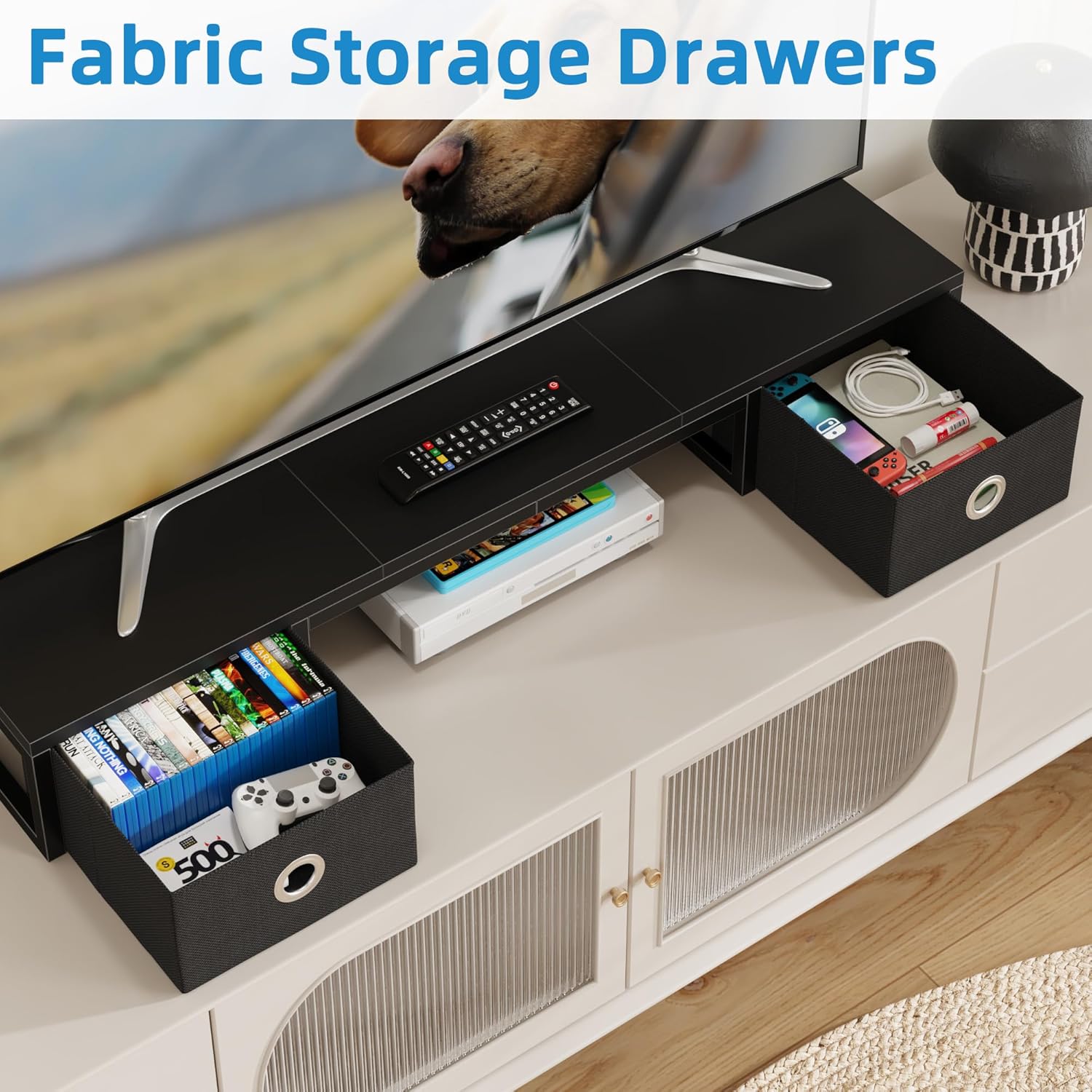 - γTV Riser with Fabric DrawersγTV shelf design with 2 drawers, offer a privacy space to storage your media remote, CDs and magazines etc. Maximize your tabletop with this tv riser stand to maintain a clean, organized look.