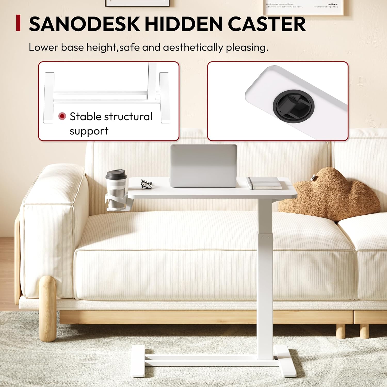 SANODESK Mobile Standing Desk with Hidden Wheels,Pneumatic Laptop Desk Rolling Computer Cart Movable Height Adjustable Small Sit Stand Desk for Home Office(27.6" W x 15.7" D, White)
