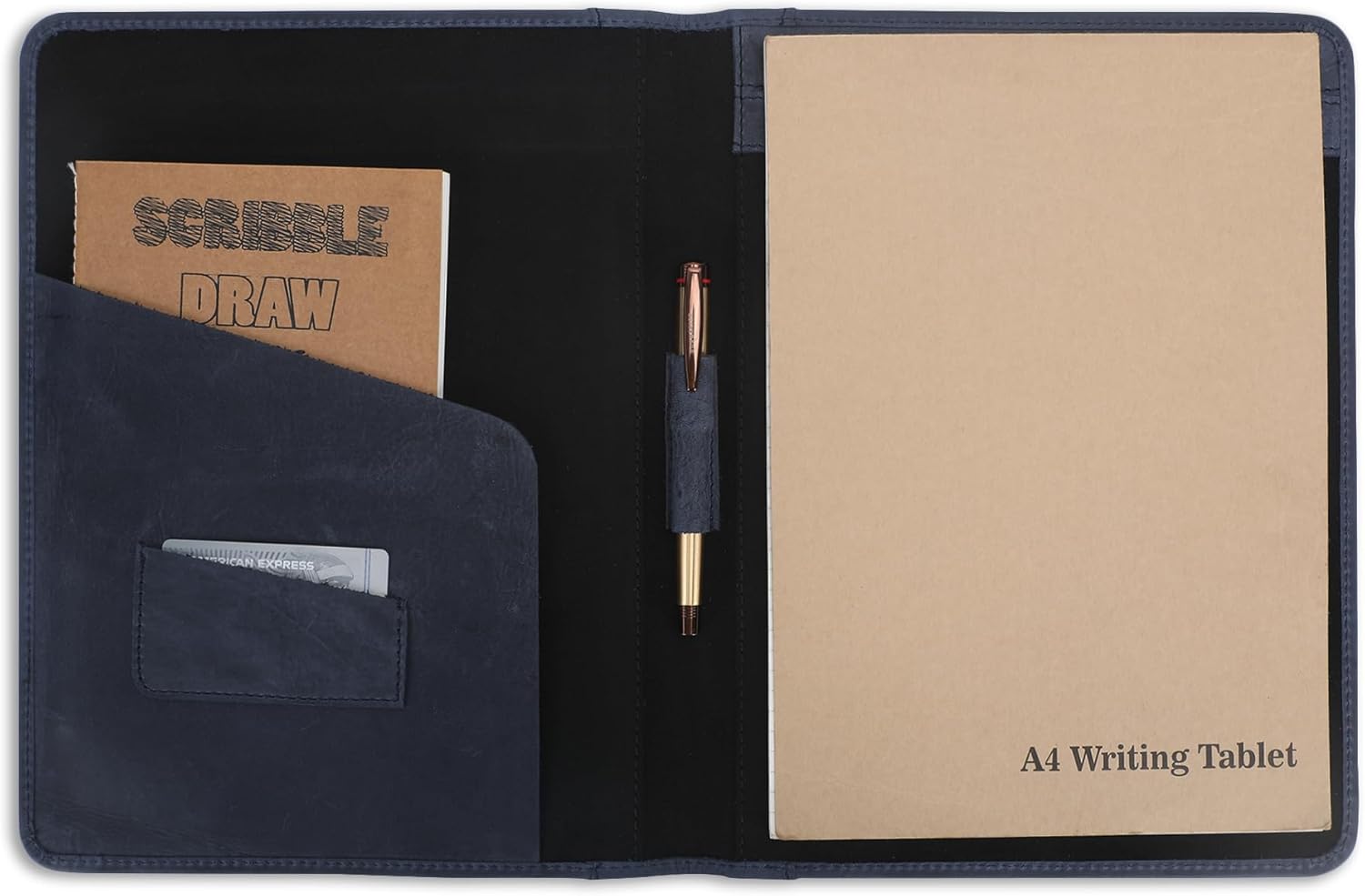- PERFECT STORAGE - Leather folder with the size of 13β x 10β, give you a plenty of storage. A sleeve holder perfect for the legal pad writing pads and A4 notepads & paper sheet, 1 pen slot, 1 wave-shaped business card holder and 1 side pockets for documents. This wonderful leather notepad construct without annoying zipper will organize your paper stuff very well. And what is more, it will add your confidence and great first impression definitely.