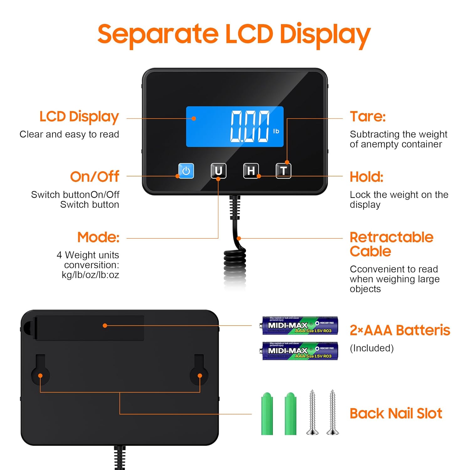 - Separate Large LED Display: The shipping scale has a larger backlit display than the marketed products, allowing for clearer readings and use at night and in dimly lit environments. Weight scale's thoughtful notch design makes it easy to store the display in one place
