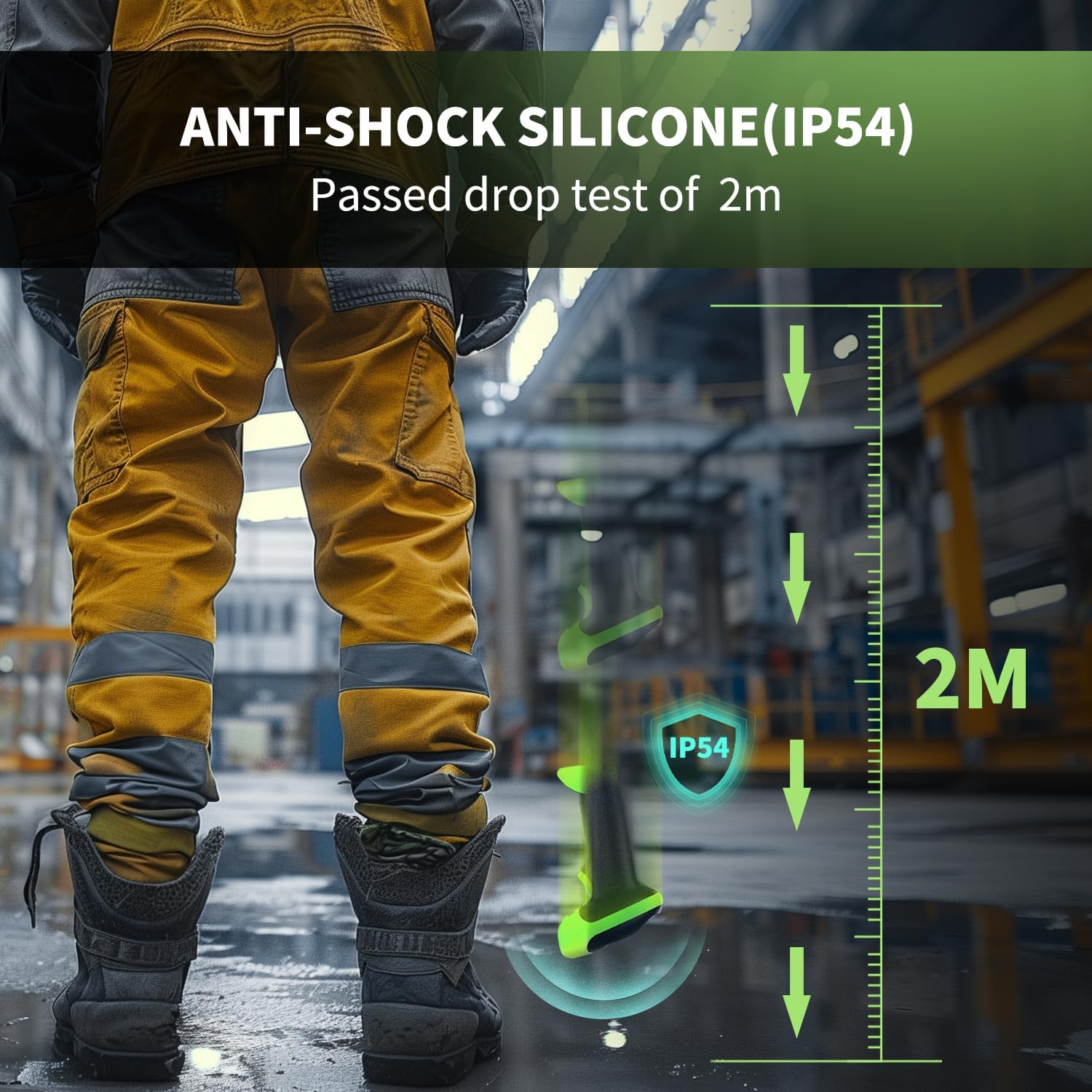 - ➤Professional Anti-Shock Design - Made of great ABS+PC materials,high shock-resistant, and the silicone protective cover can avoid the scratches and friction while falling from the height of 6.57 feet; the technical of IP54 sturdy which protect the wireless barcode scanner from dust and moisture.