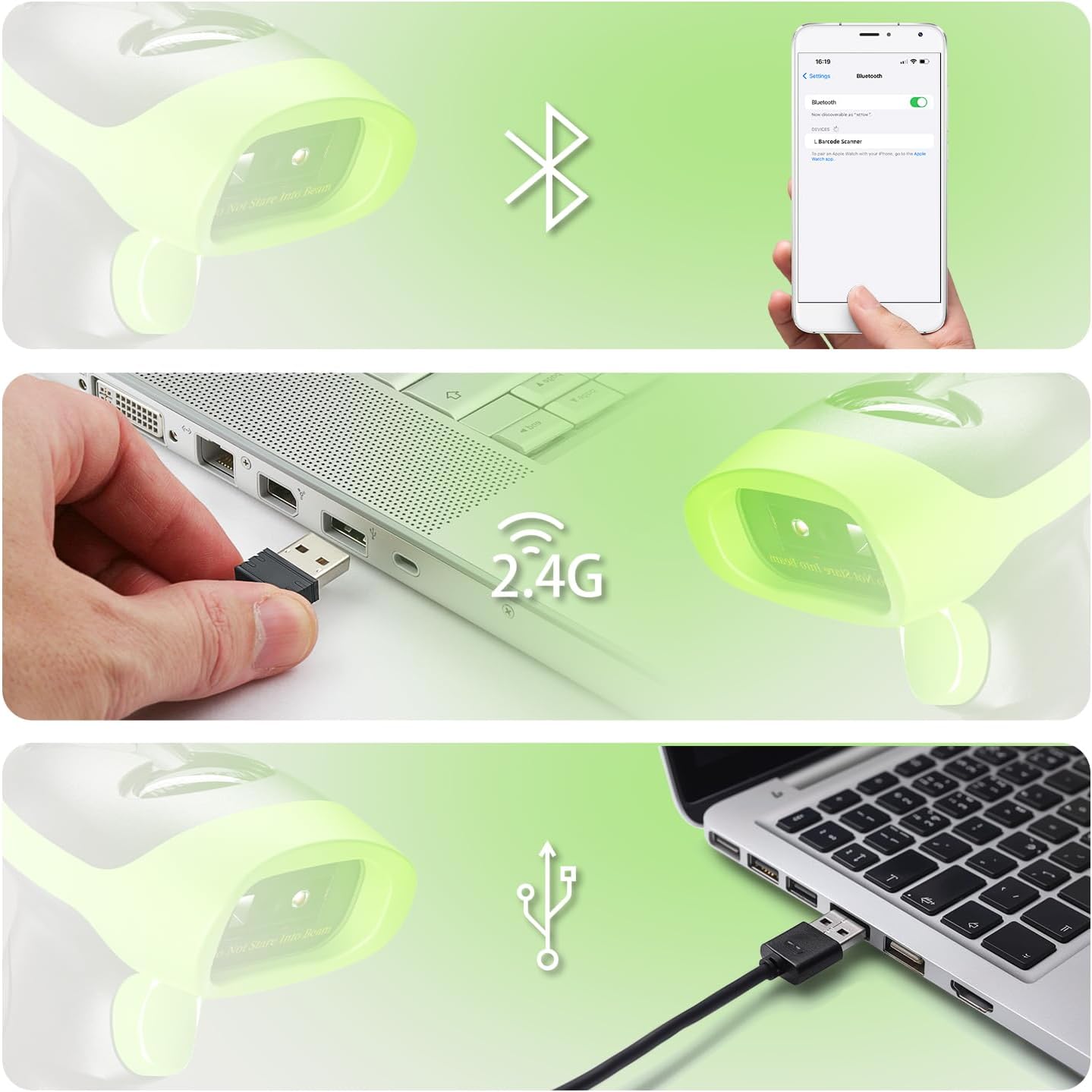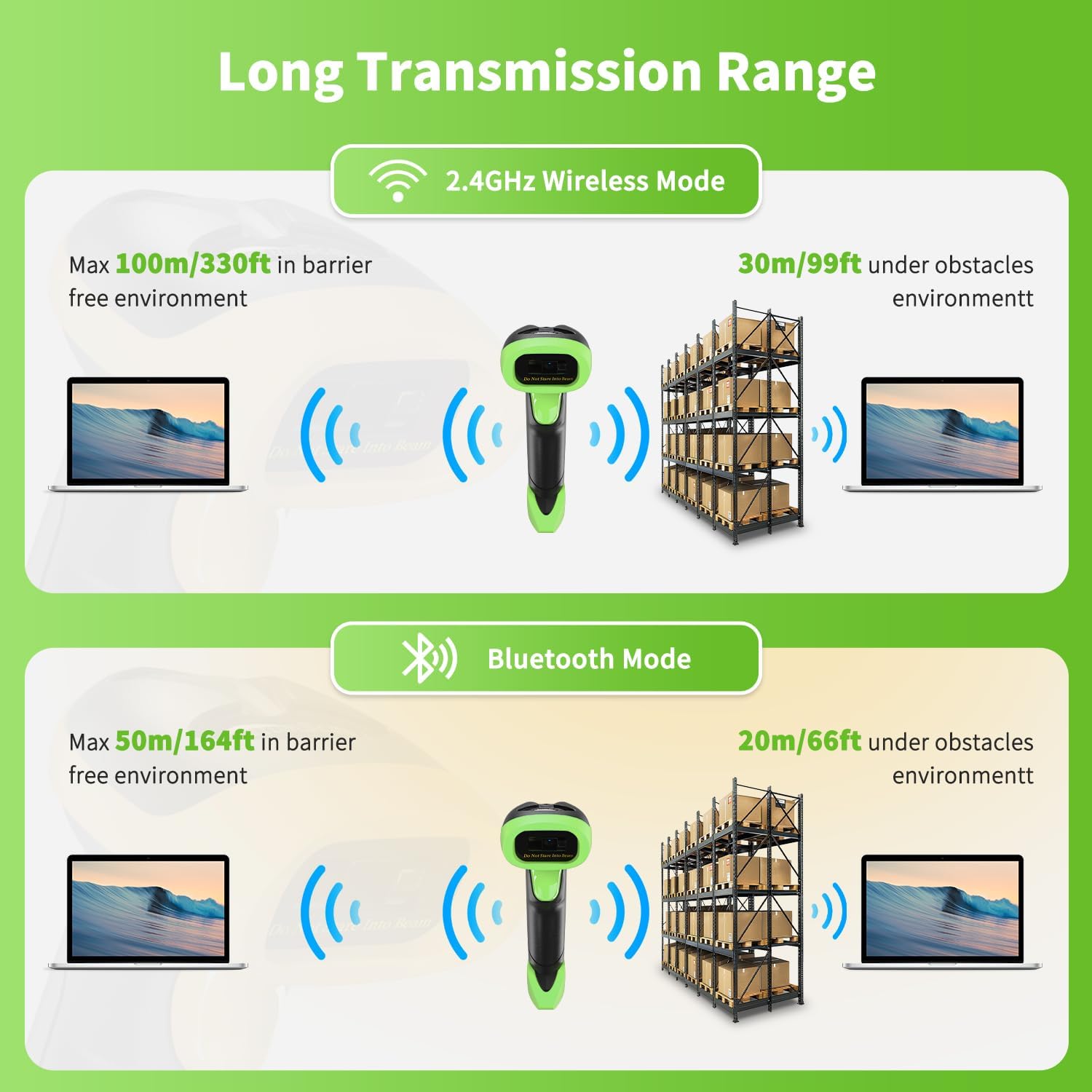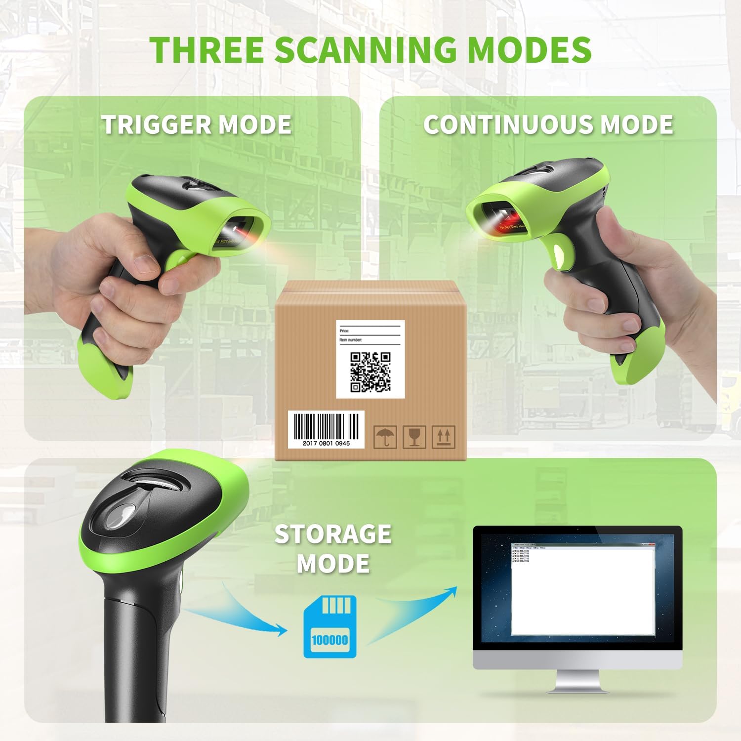 - ➤Auto Scanning & Storage Mode - Manual Scan & Auto-sensing Scan & Continuous Scan. Two working mode: Instant upload mode / storage mode. Scan and store barcodes, then update the data to your device when you come back entering the wireless transmission range. Sometimes the self-sensing scanning function is in the inactive stage, please contact us and be at your service at any time.