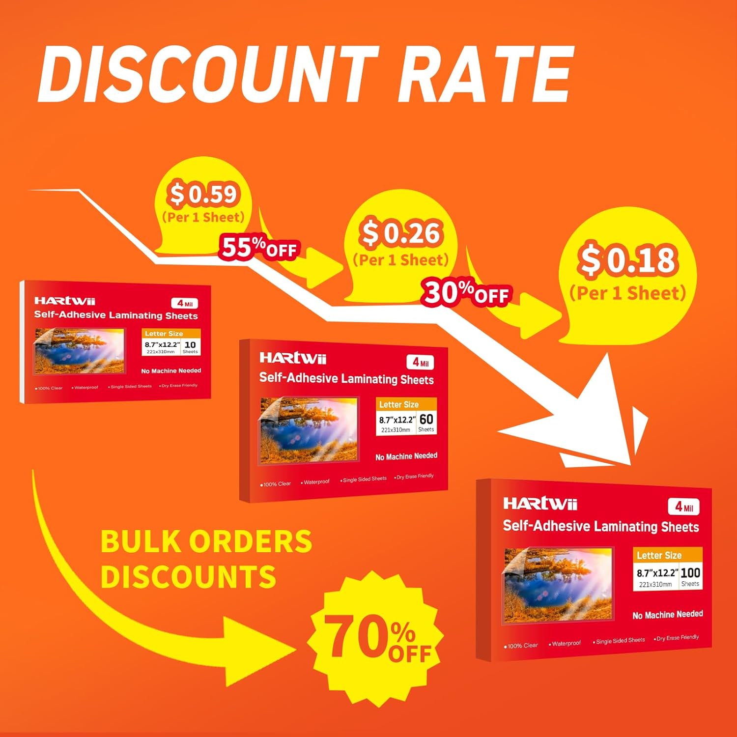 - UNIVERSAL DIMENSIONS:Hartwii Self-adhesive laminating sheets 8.7x12.2 inches ,4mil thickness ,60 pack of self sealing laminating sheets ,it suitable for laminating 8.5x11 inches ,or smaller photos ,cards,labels,and stickers ,Single Side laminating film ,you can use two single-sided self laminating sheets us lamiate both front and back of a letter size paper