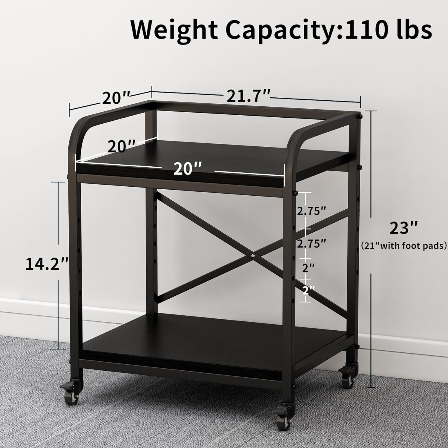 - Large Size, Spacious Space: The printer stand is designed with a 20“ x 20” square platform that holds up to 110 pounds per tier, suited for large laser printers, scanners, and other office equipment. The two-tier structure, with consistent usable area on both upper and lower layers, provides ample storage space for printing paper, ink cartridges, and other stationery, keeping your work area neat and organized.