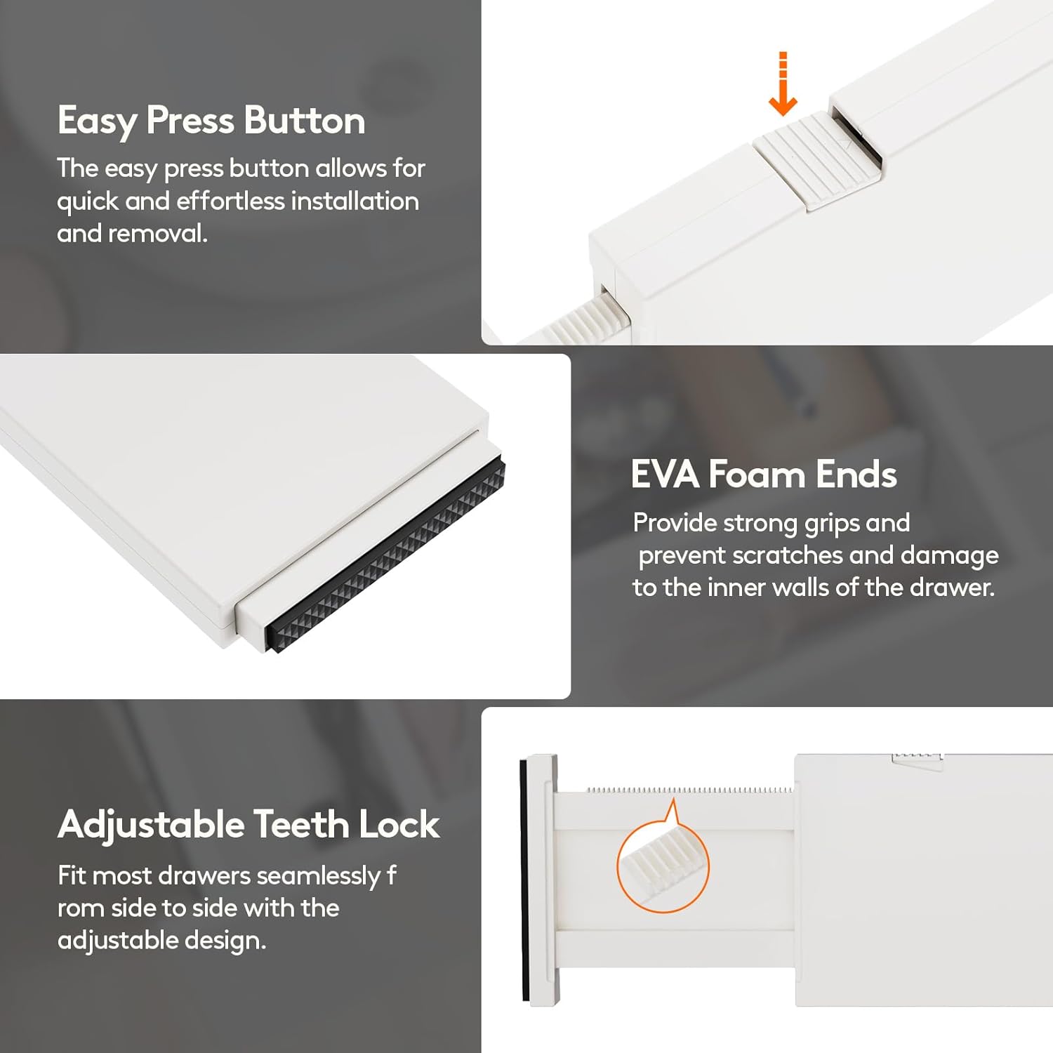 - Premium Material: Our drawer organizers for clothing are made of sturdy ABS material and include high-quality EVA foam sponges on both ends to prevent any scratches or damage to your drawerβs inner walls, leaving no trace or residue behind