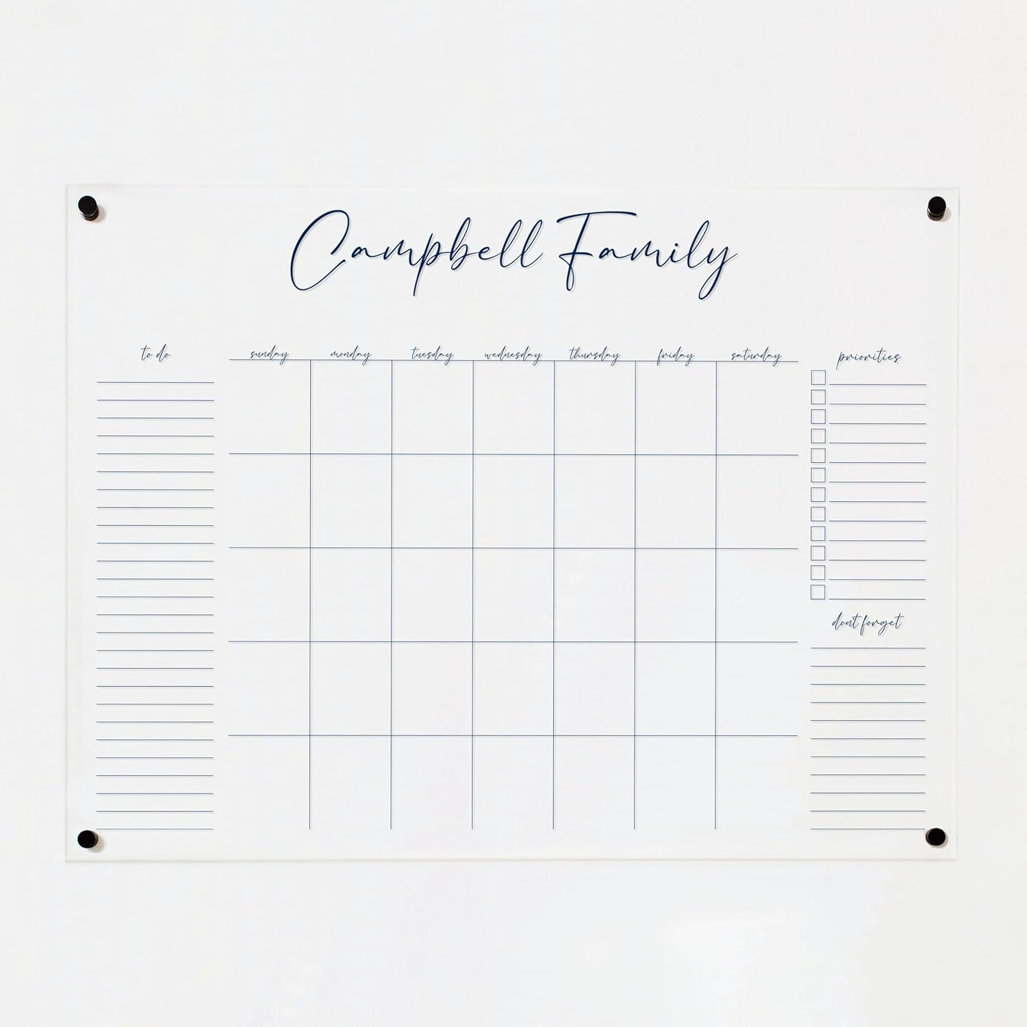 Personalized Clear Acrylic Calendar for Wall, Calendar Whiteboard for Wall, Dry Erase Wall Calendar, Wall Calendar Organizer System for Home (Cursive, Navy, 47.5"W x 36"H)