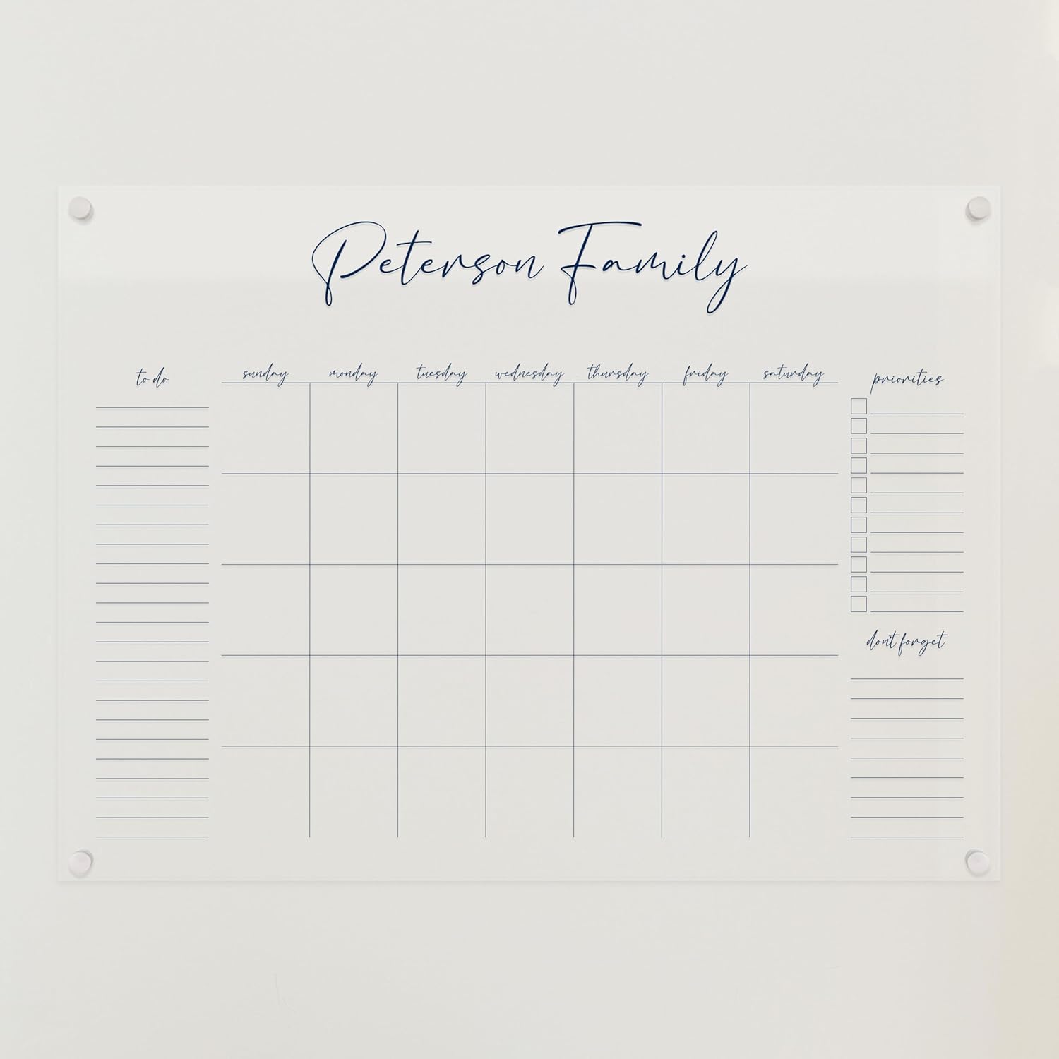 Personalized Clear Acrylic Calendar for Wall, Calendar Whiteboard for Wall, Dry Erase Wall Calendar, Wall Calendar Organizer System for Home (Cursive, Navy, 31"W x 23"H)