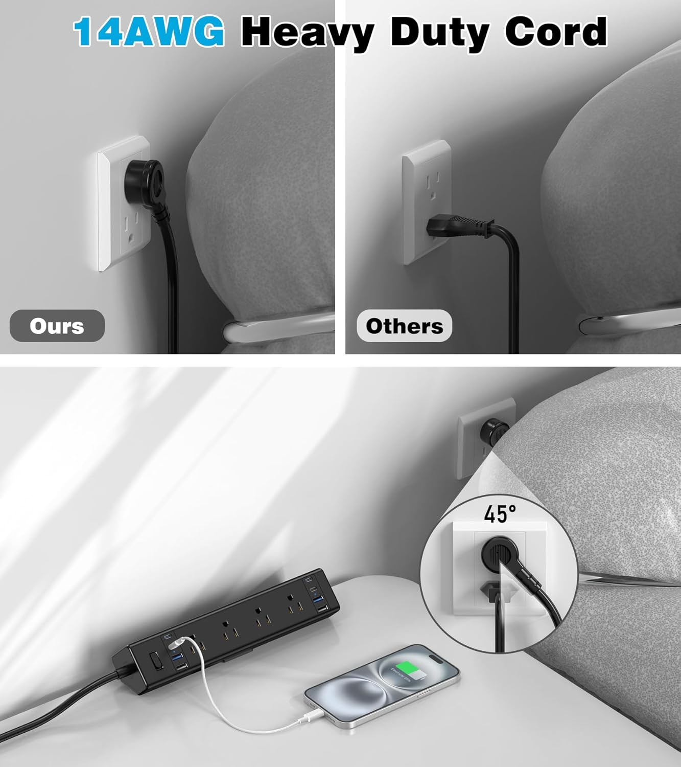 - 【45° Flat Plug & 14AWG Heavy Duty Power Cord】The 45° flat plug allows easy access to wall sockets, even in tight spaces or behind furniture. Comes with a 14AWG heavy duty 6Ft power cord. Adopting pure copper wire core to prevent equipment overload and short circuit, it can protect your equipment well.