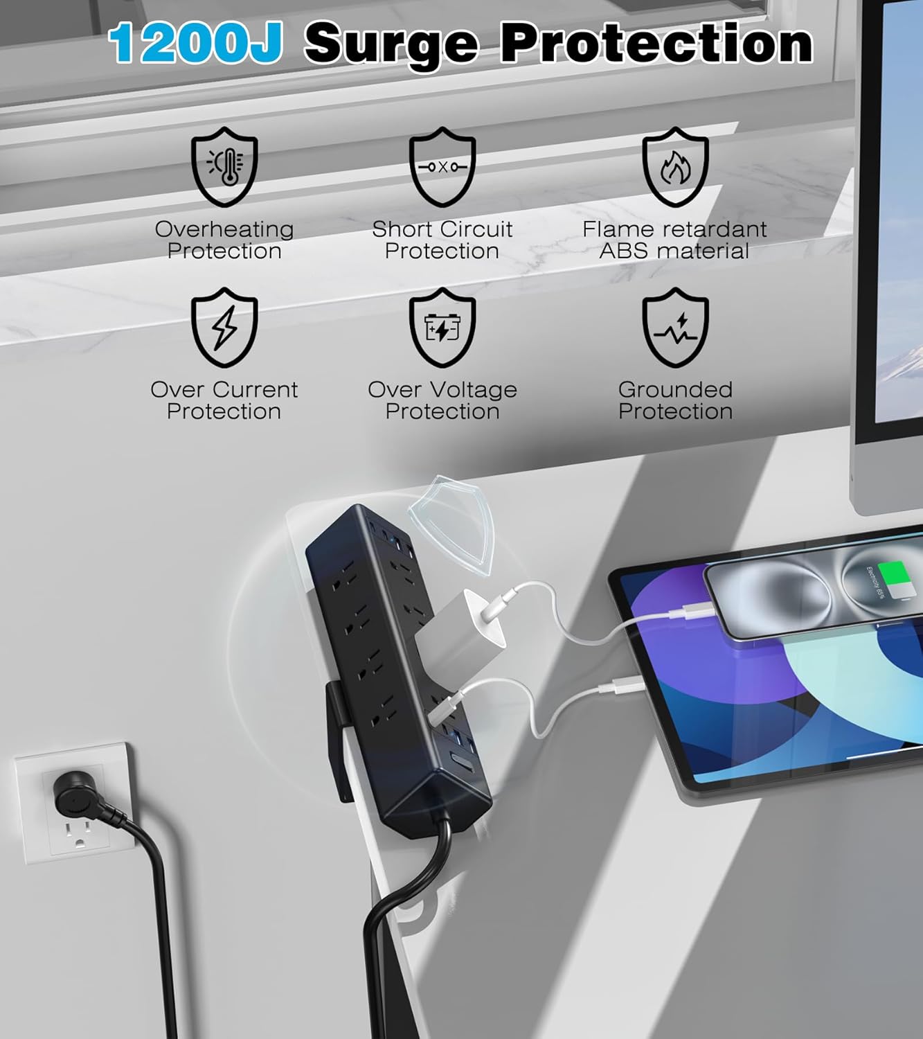 - 【1200J Surge Protection Power Strip】Constructed from fire-resistant ABS plastic, this power strip offers a 1200-Joule surge protection rating with a built-in circuit breaker to guard against overloads, short circuits, and overheating. Effectively handles voltage spikes to keep your computer and other accessories safe.