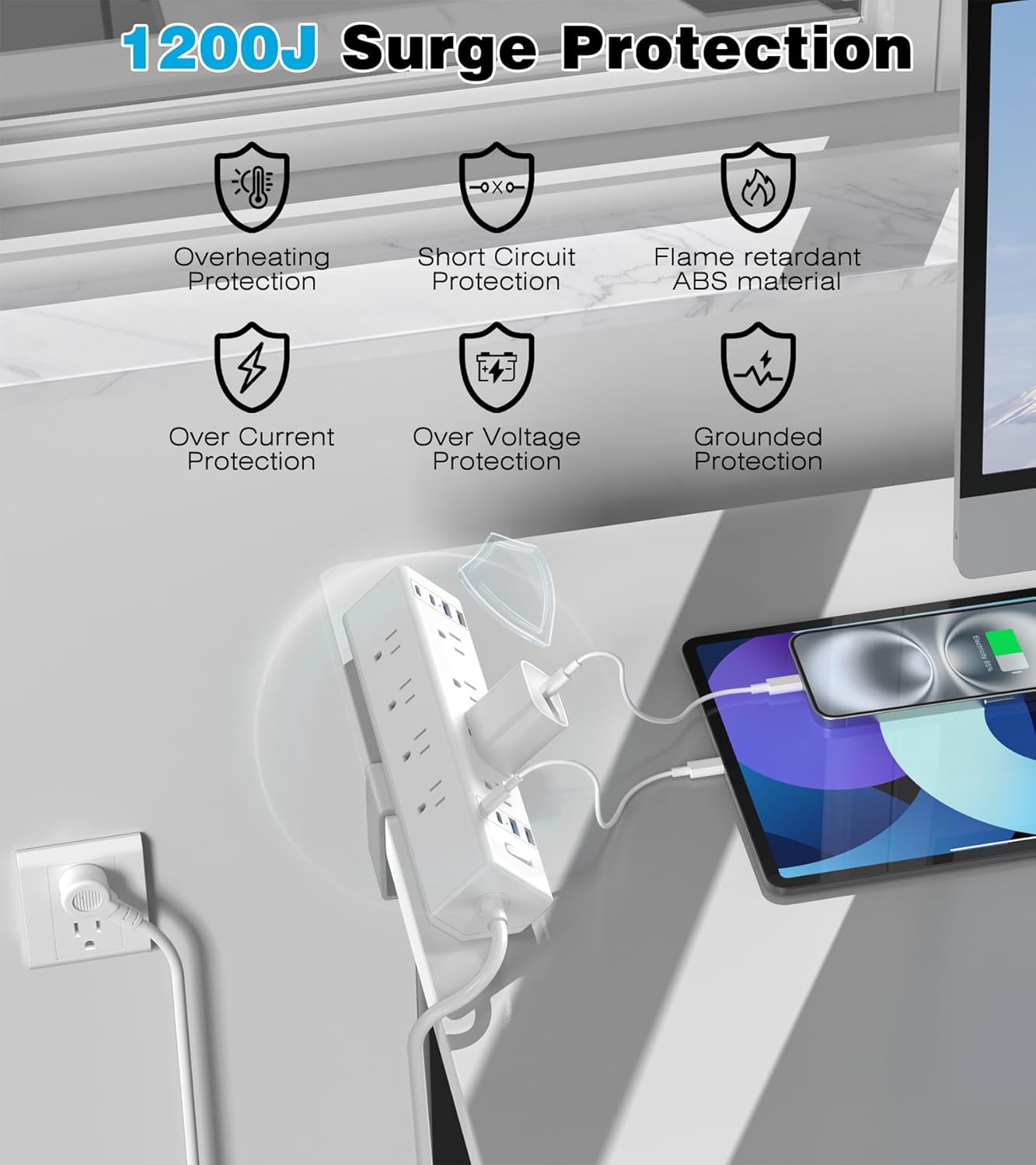 - 【Desk Clamp Power Strip with Surge Protection】Constructed from fire-resistant ABS plastic, this power strip offers a 1200-Joule surge protection rating with a built-in circuit breaker to guard against overloads, short circuits, and overheating. Effectively handles voltage spikes to keep your computer and other accessories safe.