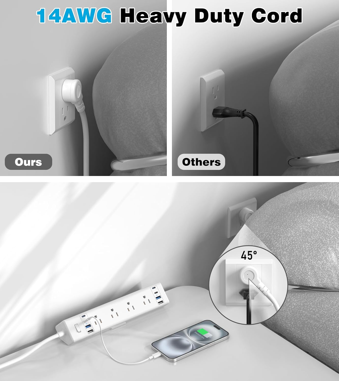 - 【45° Flat Plug & 14AWG Heavy Duty Power Cord】The 45° flat plug allows easy access to wall sockets, even in tight spaces or behind furniture. Comes with a 14AWG heavy duty 6Ft power cord adopting pure copper wire core to prevent equipment overload and short circuit, it can protect your equipment well.