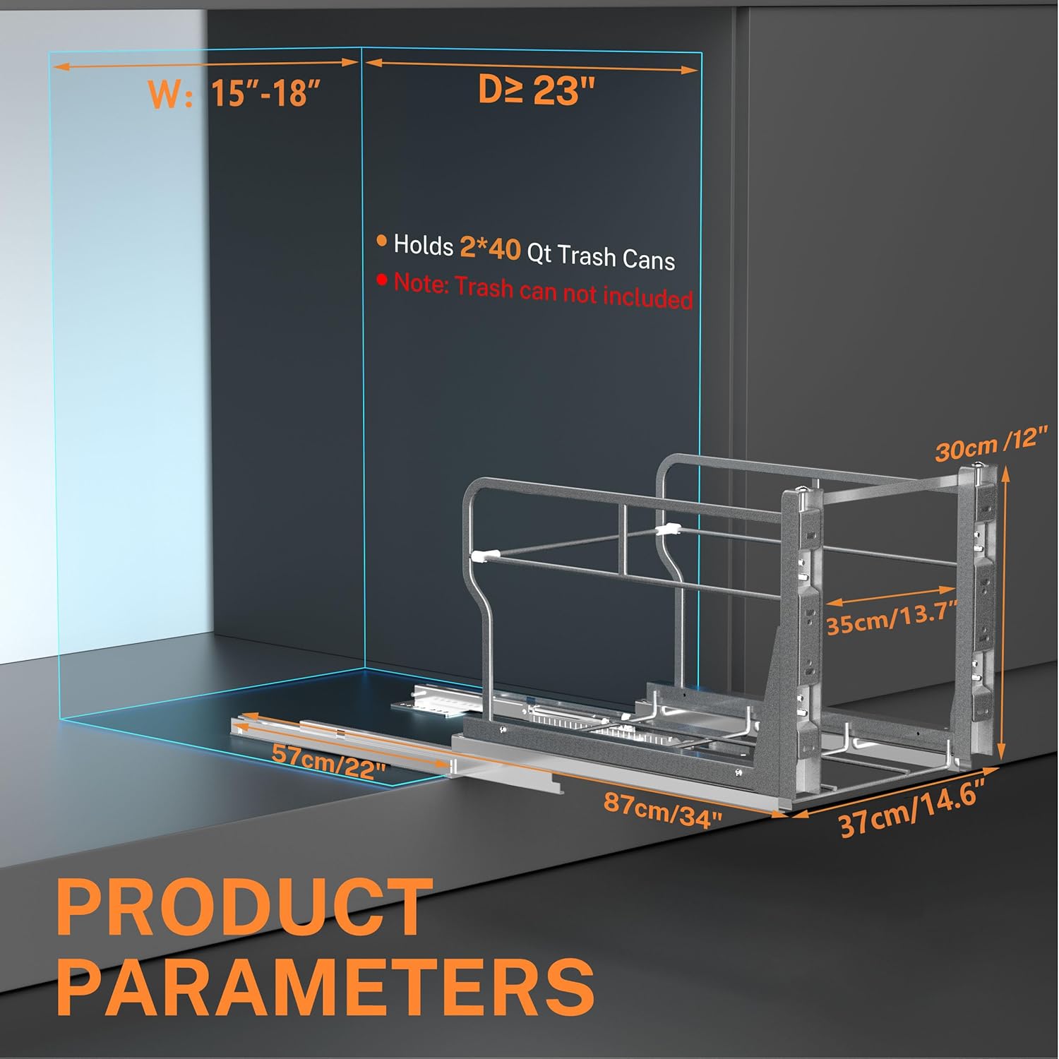 - Premiun Material: Trash can cabinet pull out is made of high-quality carbon steel with powder-coating surface for durability and rust resistance, allowing you to clean it with a cloth. Made for a trash can kitchen of 28 to 40 quarts (7β10 gal, 26β37 l) in volume, the frame can carry 120 pounds, 60 pounds more than regular slides.