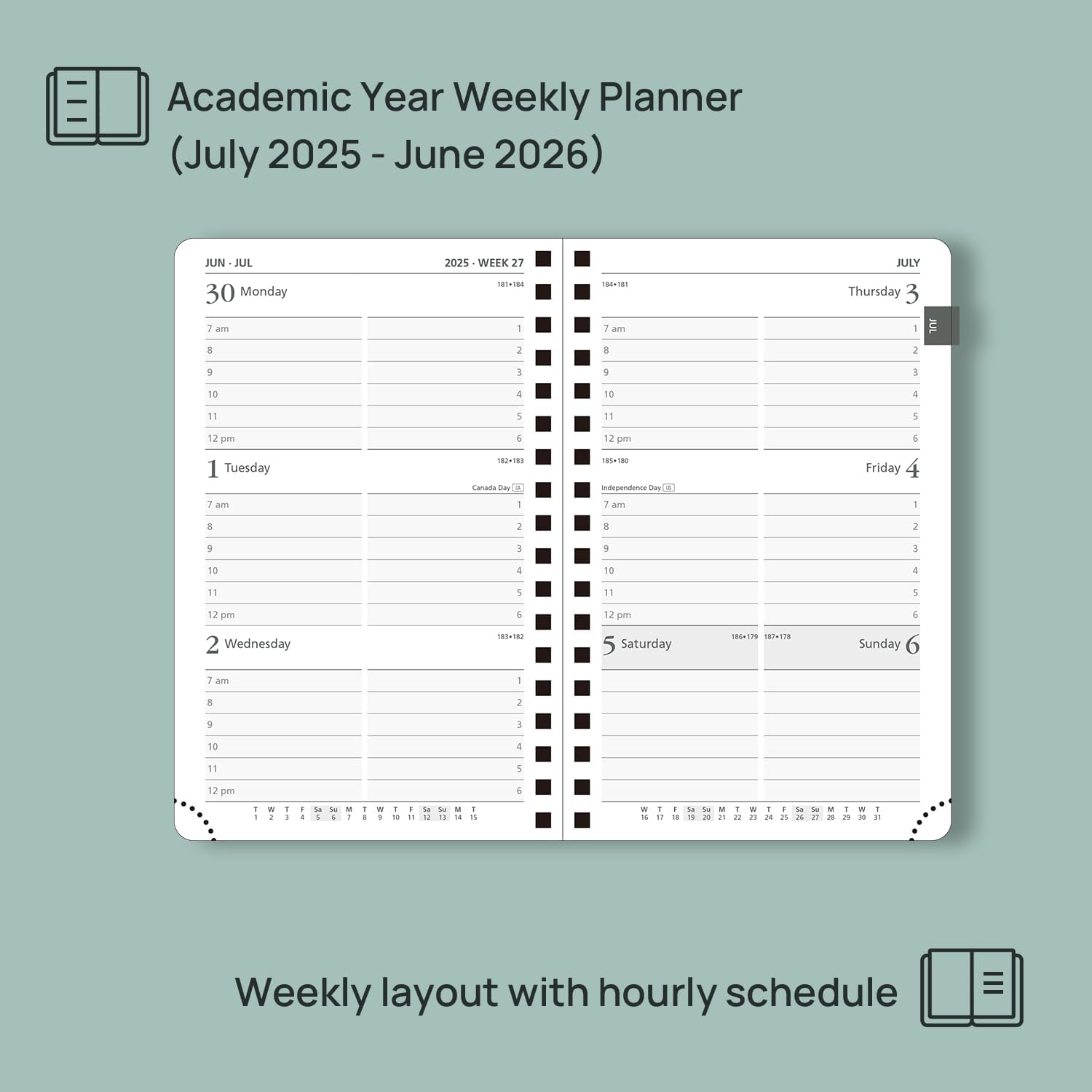 - WEEKLY CALENDAR 2025 - 2026: Our 4" x 6.25" Weekly Planner covers the period from July 2025 to June 2026, giving you the flexibility to start your planning at any point during the academic year. It features 2 vertical pages per week with hourly time slots from 7 AM to 6 PM.