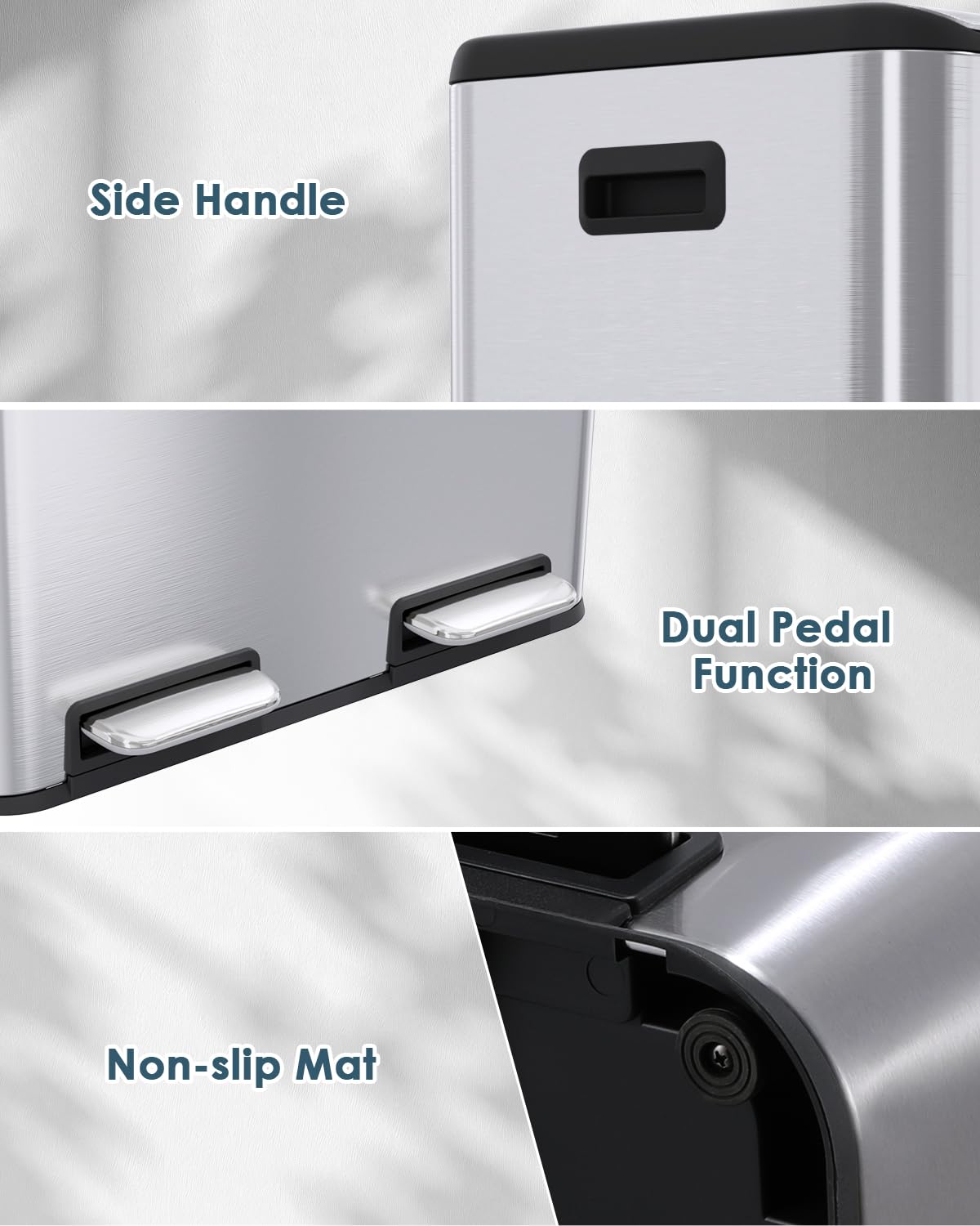 - Dual 8 gallon Compartment Bins: Trash can measures 20.3in * 14.6in * 26.2in. With a large capacity of 60 liters, it offers plenty of room for garbage and recycling, Combo garbage bin comes with two removable inner barrels, and each compartment has an independent lid and a widened pedal, which effectively isolates the smell of garbage and facilitates the opening of each compartment.
