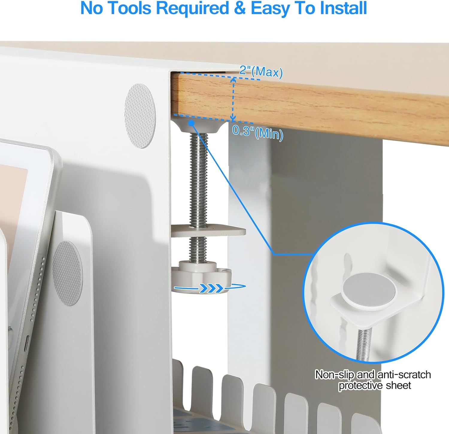 - γClamp Under Desk Storage & No Drill DesignγOur clamp on side desk storage requires no drilling or tools. The rubber cushion prevents scratches on desks and other objects, and the rounded corners design also helps avoid scratches.