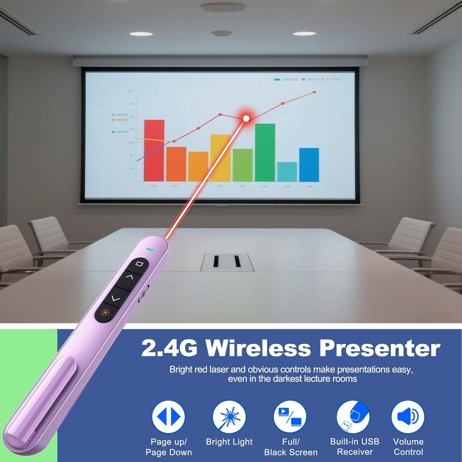 - γBRIGHT RED LIGHTγ This clicker for PowerPoint presentations can easily highlight important areas of the presentation with a bright red beam so that your audience will not miss any key points. It is suitable for all kinds of backgrounds and is clearly visible even in large auditoriums