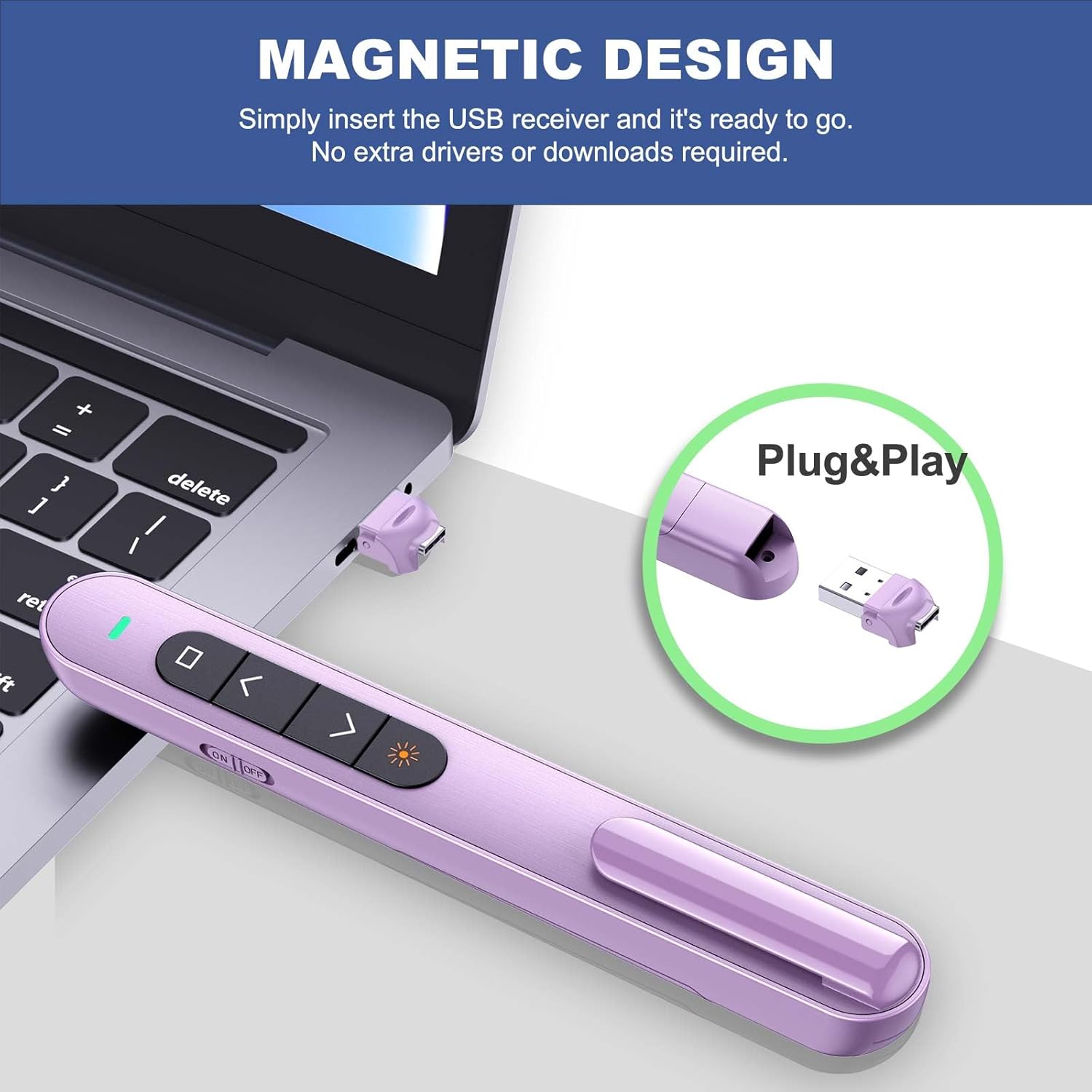 - γPLUG & PLAY PRESENTATION CLICKERγThe intuitive touch buttons of this presenter clicker integrate hyperlink navigation, page up/down, volume control, power switch, and full screen/black screen functions. No software is required, just connect the magnetic 2.4 GHz USB receiver at the bottom of the clicker to your computer and it's ready to use. (Powered by 1 AAA Battery is not included)