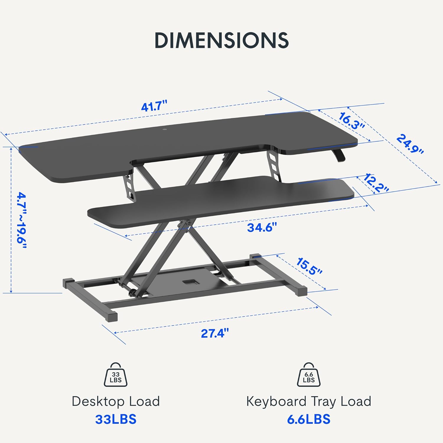 - Sturdy Construction: Built on a robust X-frame structure, our desk converter offers exceptional load-bearing capabilities. The upper desktop can support up to 33 pounds, and the keyboard tray handles an additional 6.6 pounds. This sturdy design ensures smooth, effortless adjustments, allowing you to transition between heights without compromising stability.