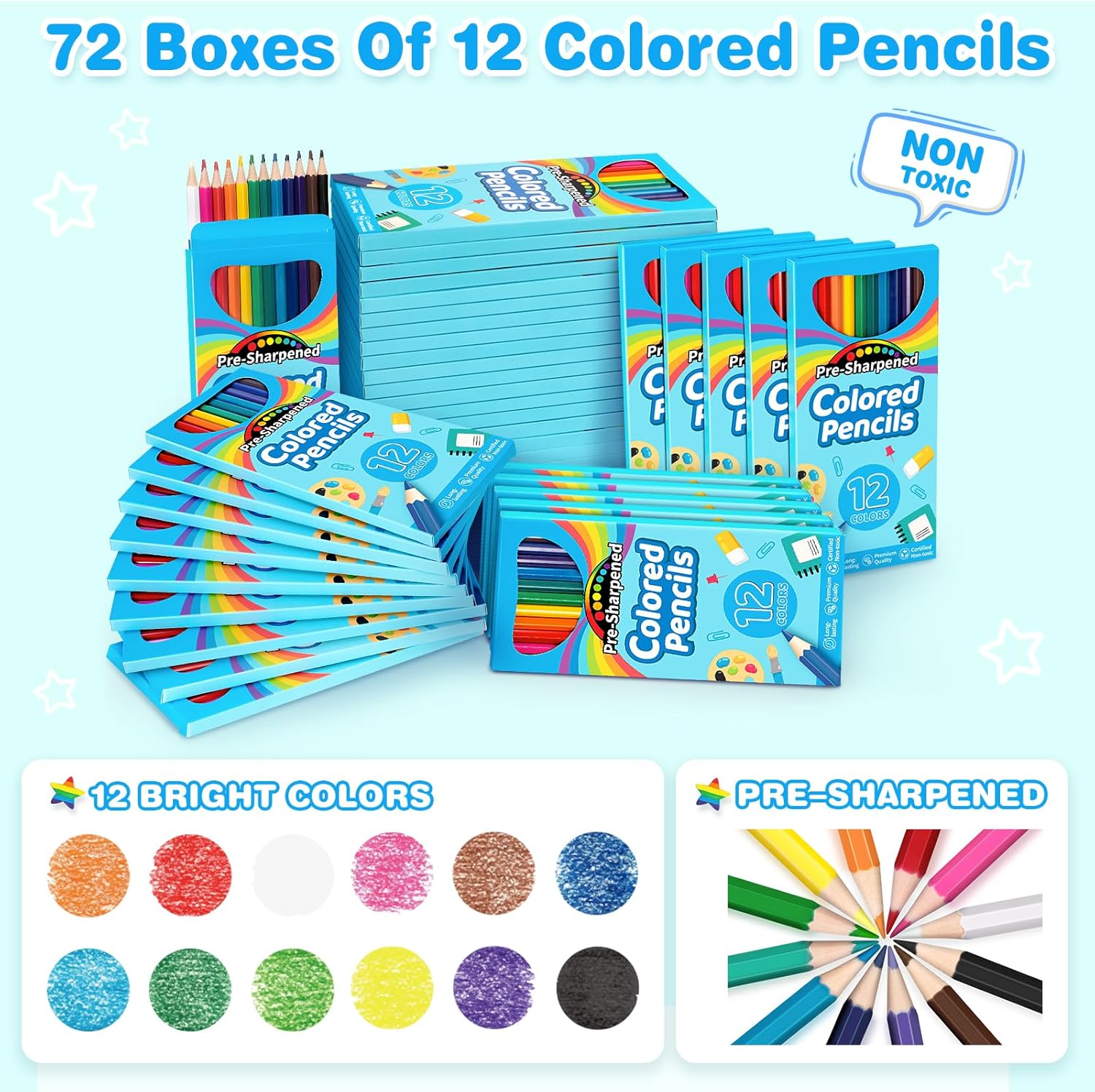 - Wonderful Back to School Supplies - Our 72 packs of colored pencils in 12 colors, meet all coloring needs, enough for students in the class. These coloring supplies are perfect for art projects, coloring books, art homework, or making holiday decorations. Get ready for back-to-school season or stock up on classroom prizes with this convenient and versatile bulk set of color pencils!