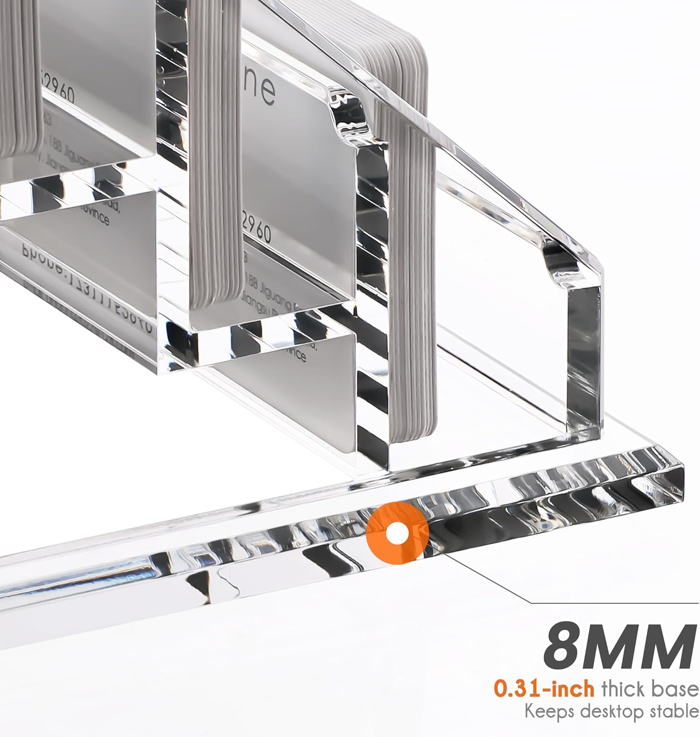 - STURDY BUSINESS CARD HOLDER:Our business card organizer size is 4.72"L x 4.33"W x 4.33"H,8mm(0.3 inches) thickened base,5mm(0.2 inches) thickness acrylic material. Weight: 0.7 lb.Good quality thickened acrylic name card holder, crystal texture ,sturdy and durable, smooth edges, no hand injury, integrated,no assembly required,easy to clean