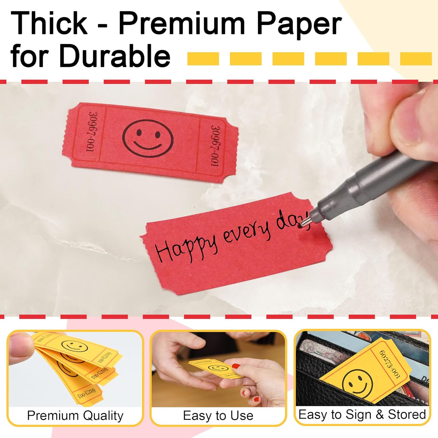- DUAL-COLOR DESIGN: The tickets come in a vibrant yellow and red color set, with 500 tickets of each color.