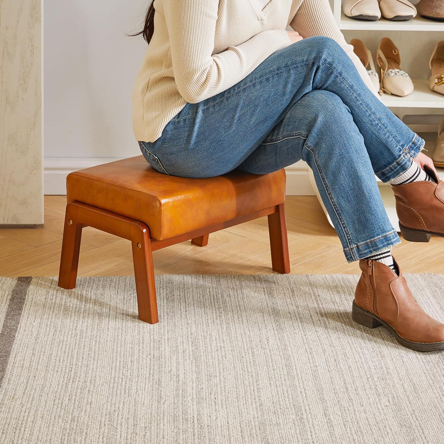 IBUYKE 10.2” H Small Foot Stool Ottoman, Rectangle PU Faux Leather Foot Rest with Padded Seat and Wood Legs, Modern Ottoman Foot Rest for Living Room Bedroom Couch Office, Yellowish-Brown WBD013J