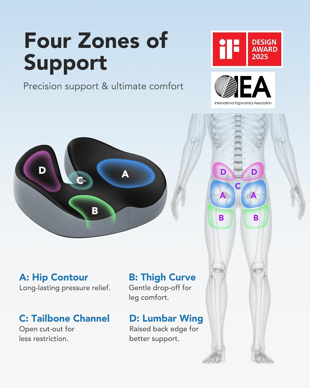 - Four-Zone Ergonomic Comfort: Featuring four distinct support zonesβhip contour, thigh curve, open tailbone channel, and lumbar support wingsβthis chair cushion is shaped to fit your body's natural form. The ergonomic design evenly distributes pressure, helping to reduce fatigue, numbness, stiffness, and pain. This seat cushion for office chairs is a must-have for long periods of sitting, whether youβre using it on your office chair or in your car. Say goodbye to chronic discomfort with this pressure relief seat cushion.