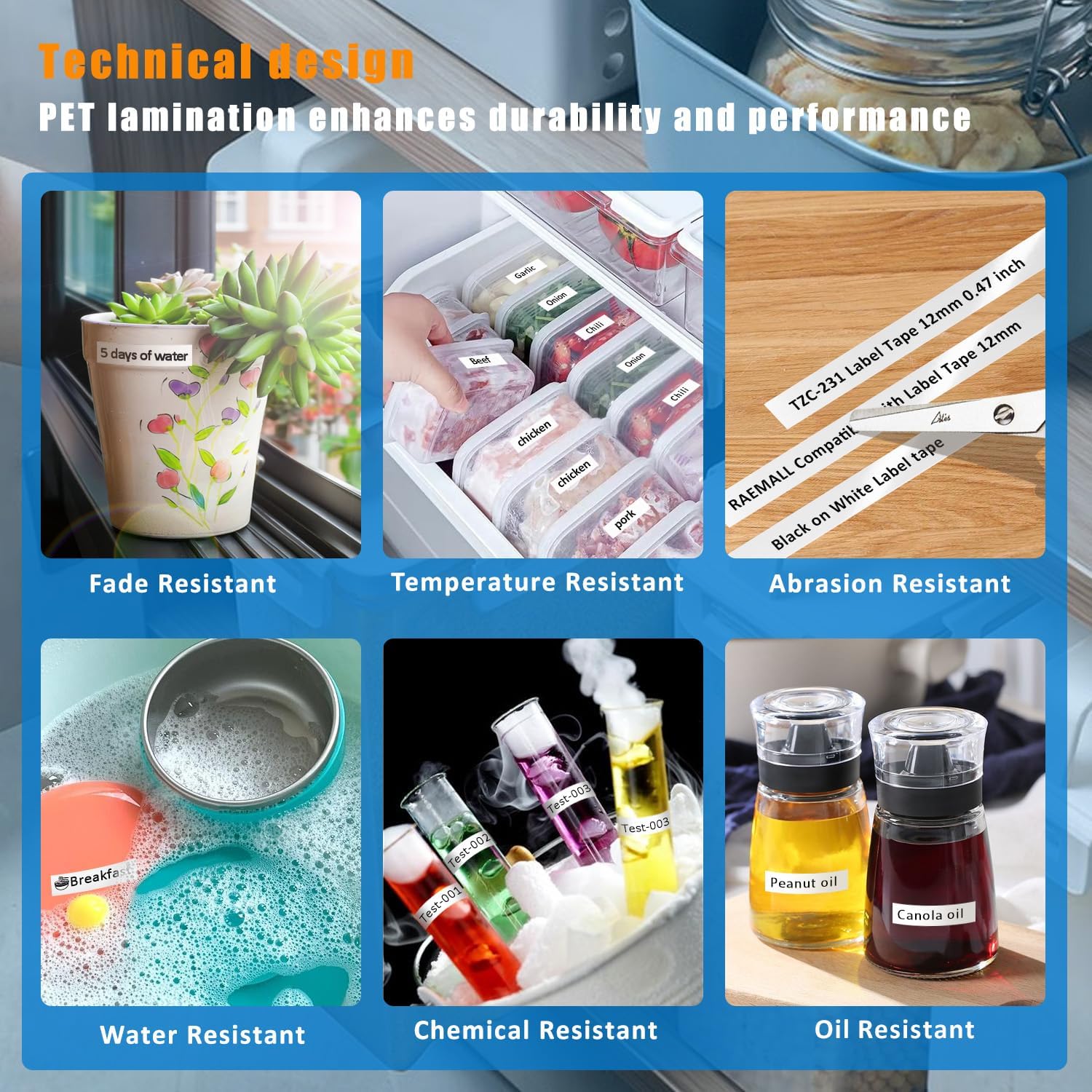 - 18 Pack Label Maker Tape Replacement for Brother Label Maker with TZe231 Laminated P Touch Label Tape; Color: Black Print on White Tape; Width: 0.47 inch (12mm); Length: 26.2 Feet (8m)
