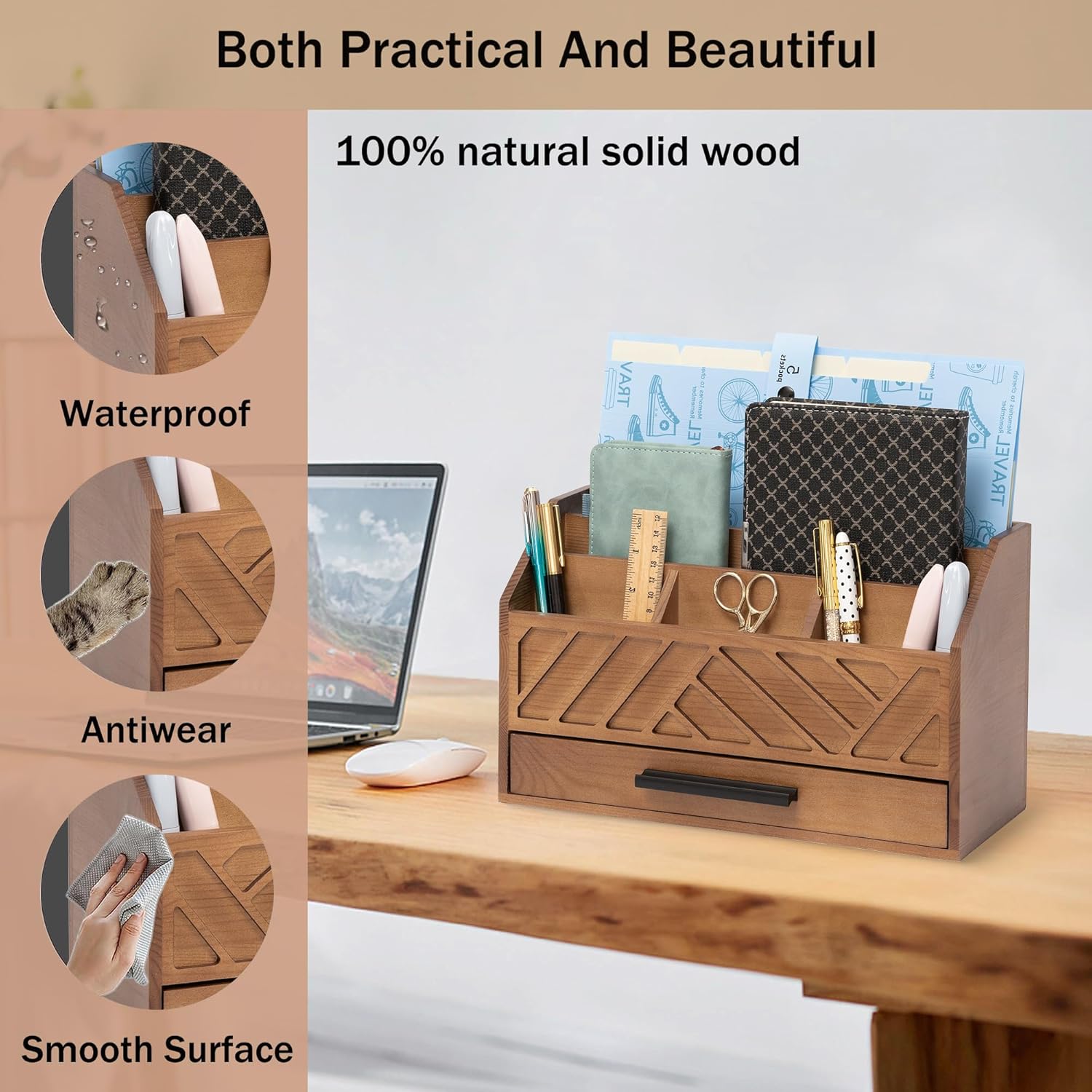 Brown Wood Desk Organizer and Accessories with Drawer, Bill Mail Organizer and File Mail Holder for Office Supplies, Modern Desk Accessories & Workspace Organizers for Desk Organization