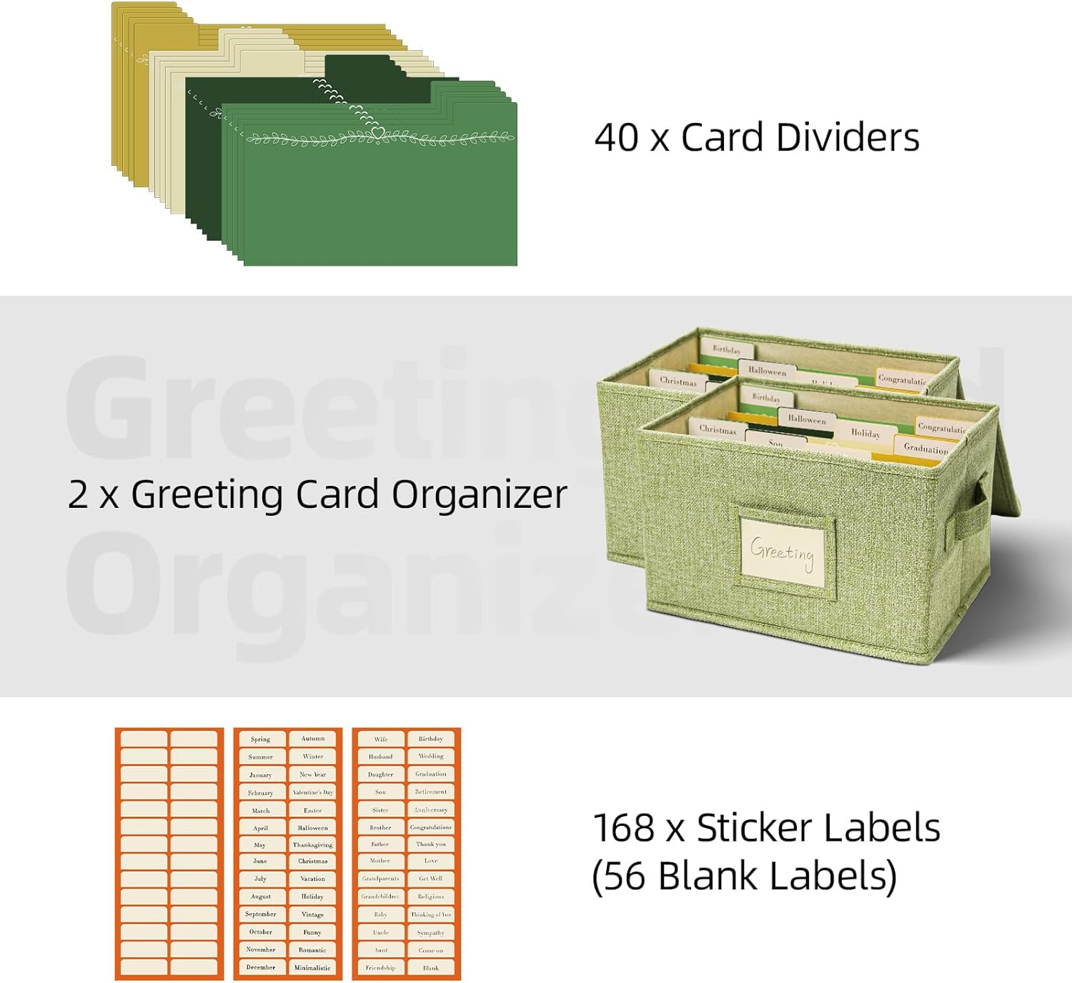 Vienrose Greeting Card Organizer Storage Box with 20 Removable Dividers, 84 Self-stick Labels, Perfect for Photos, Envelopes, Scrapbooking, Paper, Stickers Holder 2 Pack Grass Green