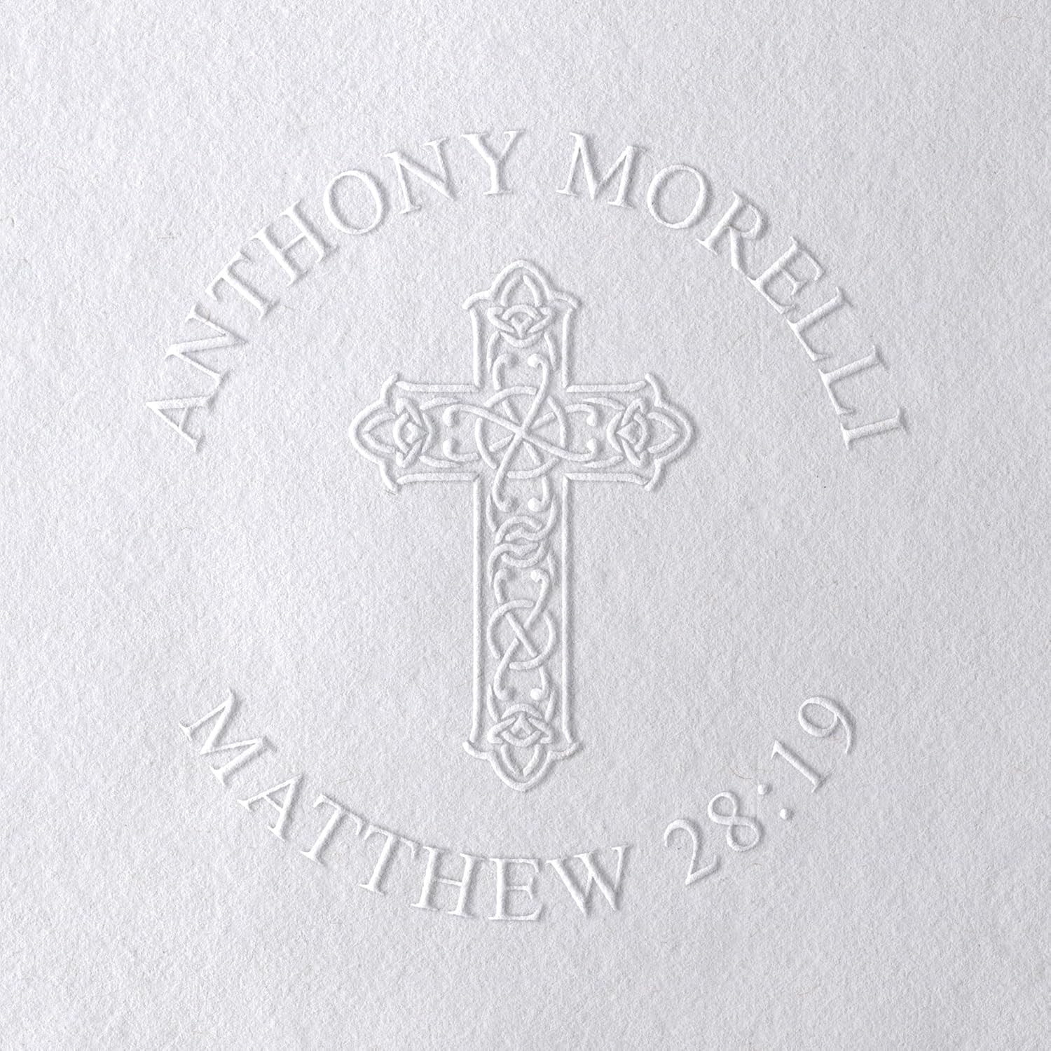 - Choose from a collection of designs - Each stamp is personalized and made to order with your name and a bible verse and a decoraive cross in the center. Each design makes an impression of approximately 1.45 inches in size. Your lettering size and spacing may differ from the sample shown depending on the length of your name and verse.