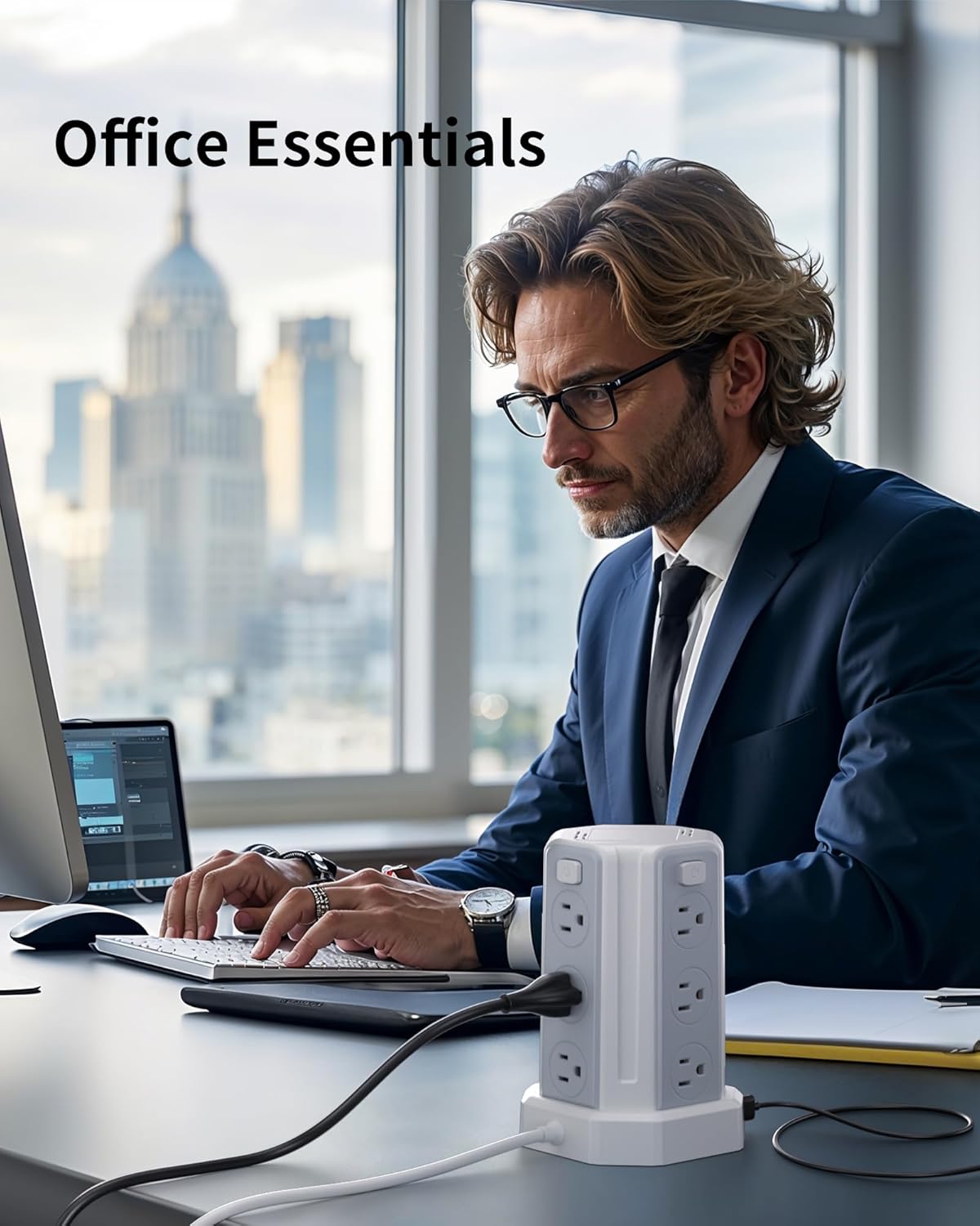 - 【16-in-1 Surge Protector Power Strip Tower with Long Extension Cord】 Maximize workspace efficiency with this versatile 6.5FT/10FT/16.4FT heavy-duty extension cord power strip, combining surge protection and extended reach. Its compact tower design organizes 12 AC outlets + 4 USB ports (3 USB-A + 1 Type-C) to declutter desks in homes, offices, or dorms. The extended surge protector outlet eliminates cable chaos while providing flexible placement anywhere indoors.