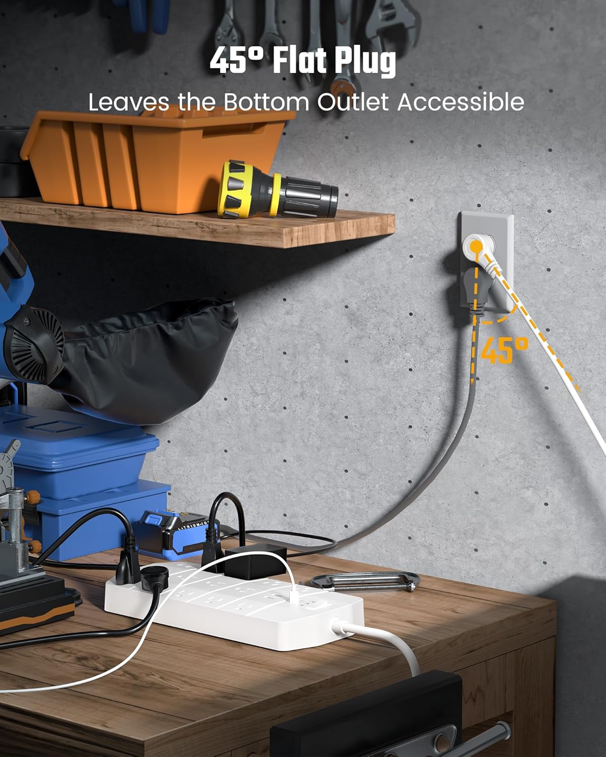 - Space-Saving Design: A clean workspace is essential for efficiency and productivity. A 45Β° flat plug is meticulously designed to fit in tight spaces behind the workbench or furniture, while leaving the bottom outlet usable. Screws and a drill template are included for you to easily wall-mount the power strip for easier access to power.