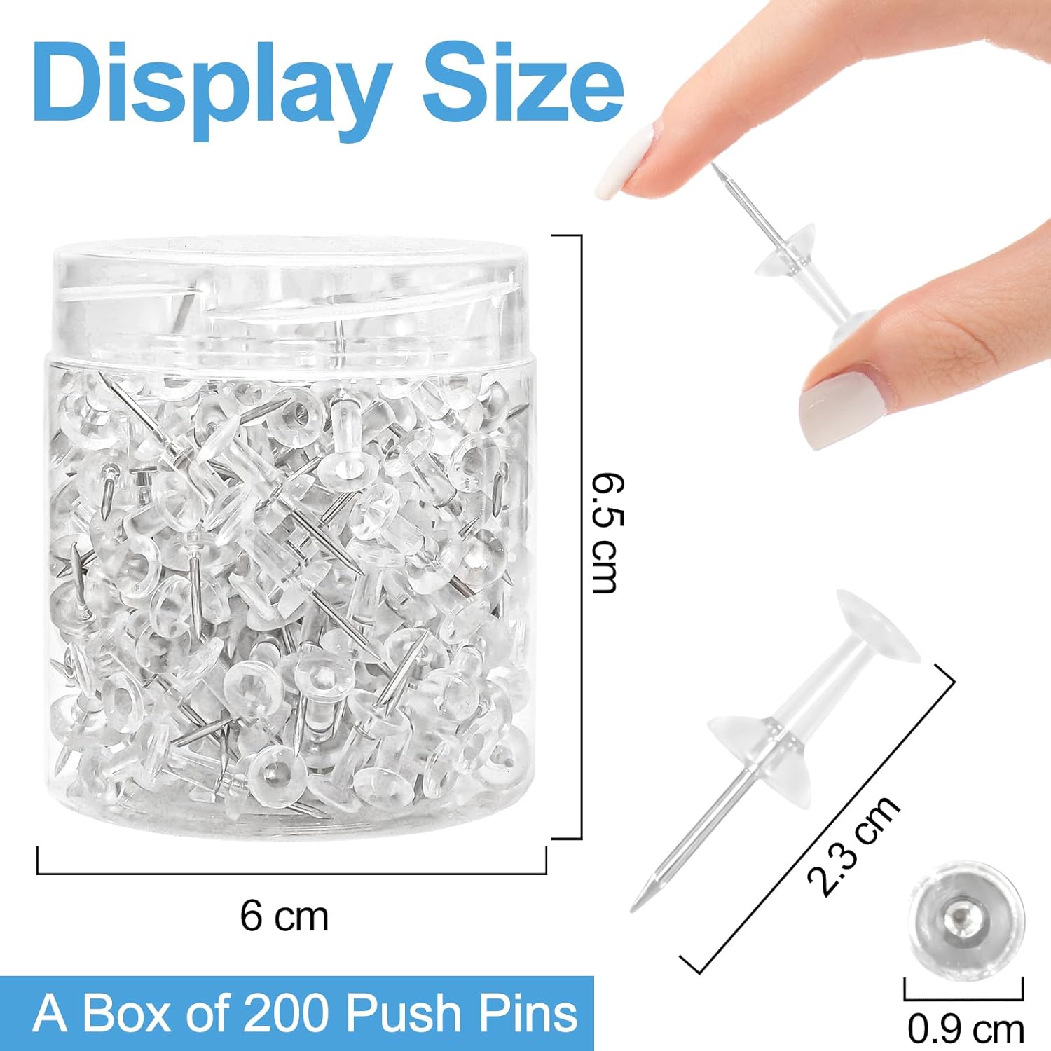 - SIZE AND REUSABLE BOXES : These pushpins are 0.9 cm in diameter and 2.3 cm in total length.Packed in reusable clear container jar to keep your desk or drawer organized, keeping thumbtacks in place that you can get them quickly. After using wall pins for hanging, just put it back for reuse