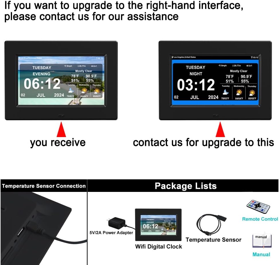 - γ2024 Newest developed, Multifunctional clockγ: β Network clock, β‘Weather clock, and β’Elderly clock. It can connect to network and display real-time weather forecasts, indoor and outdoor temperature and humidity, and a perpetual calendar. It features an extra-large font to display the time, date, and day of the week. built-in 8 alarm sets and announces the time hourly with voice prompts. has 8 OS languages
