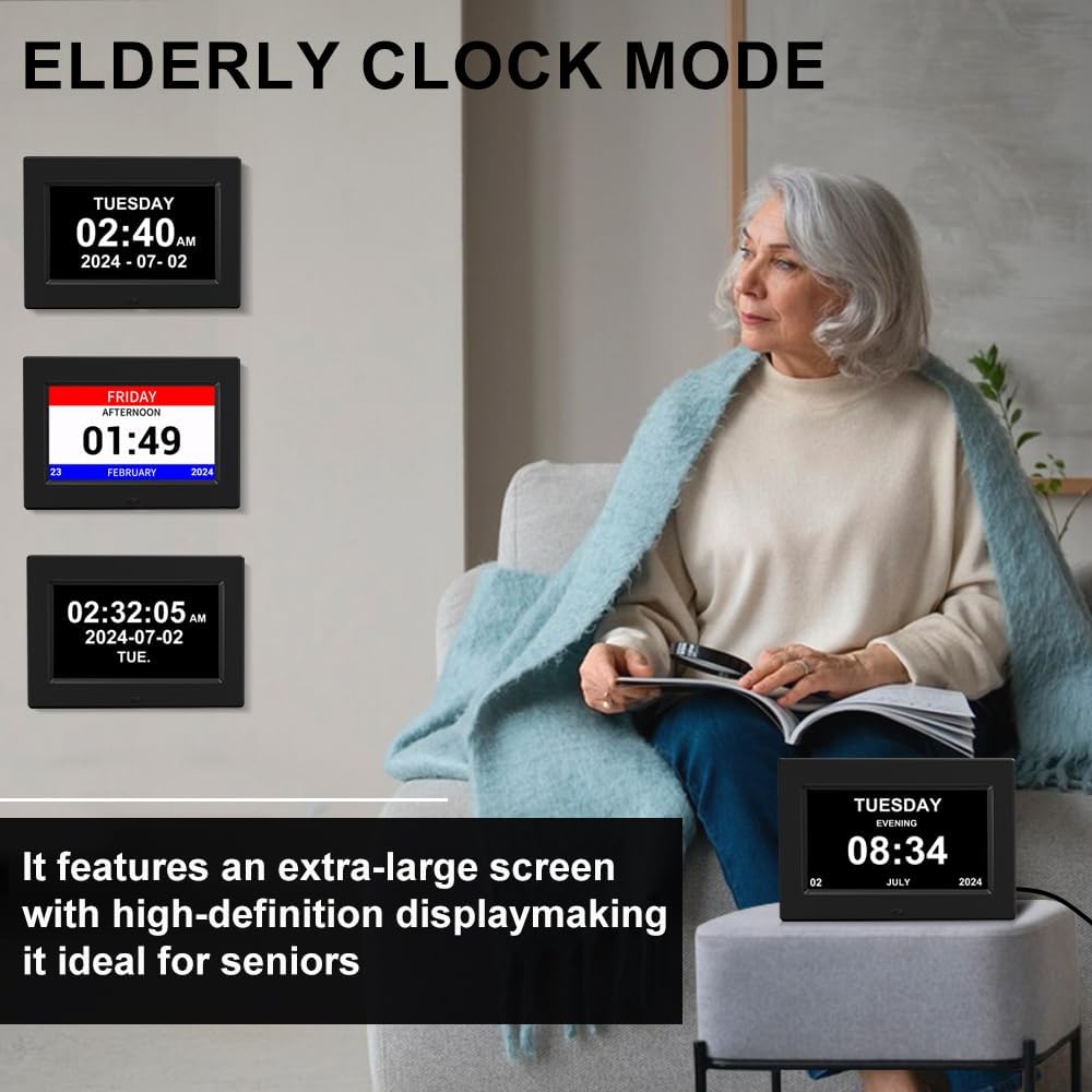 - γElderly Clockγ: It features an extra-large high-definition screen . The time, date, and day of the week are shown in large, non-abbreviated, andγ easy-to-read font, making it ideal for seniorsγ. Additionally, it includes 8 icon-based alarm groups for activities such as taking medication, exercising, and waking up. When an alarm goes on, the corresponding icon is displayed to remind you of the current activity. it has a voice time announcement feature that announces the time every hour