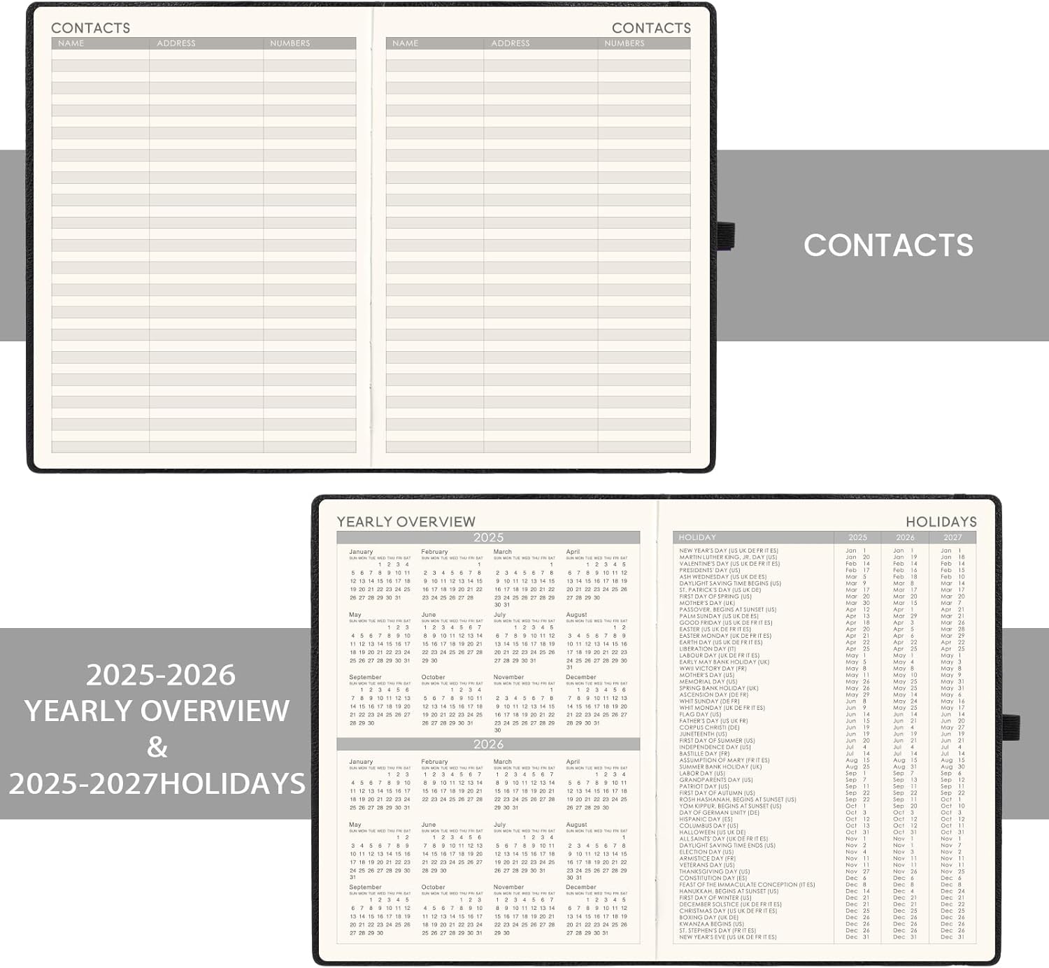 - FEATURED - A4 Planning Pages | Soft Cover | Calendar Stickers | Pen Holder | Quick Reference Information | 2025-2026 Yearly Overview | 2025-2027 Holidays | 2 Contacts Pages | Elastic Closure | Two-colored Bookmark | Inner Pocket | Julian Date| 25 Note Ruled Pages.