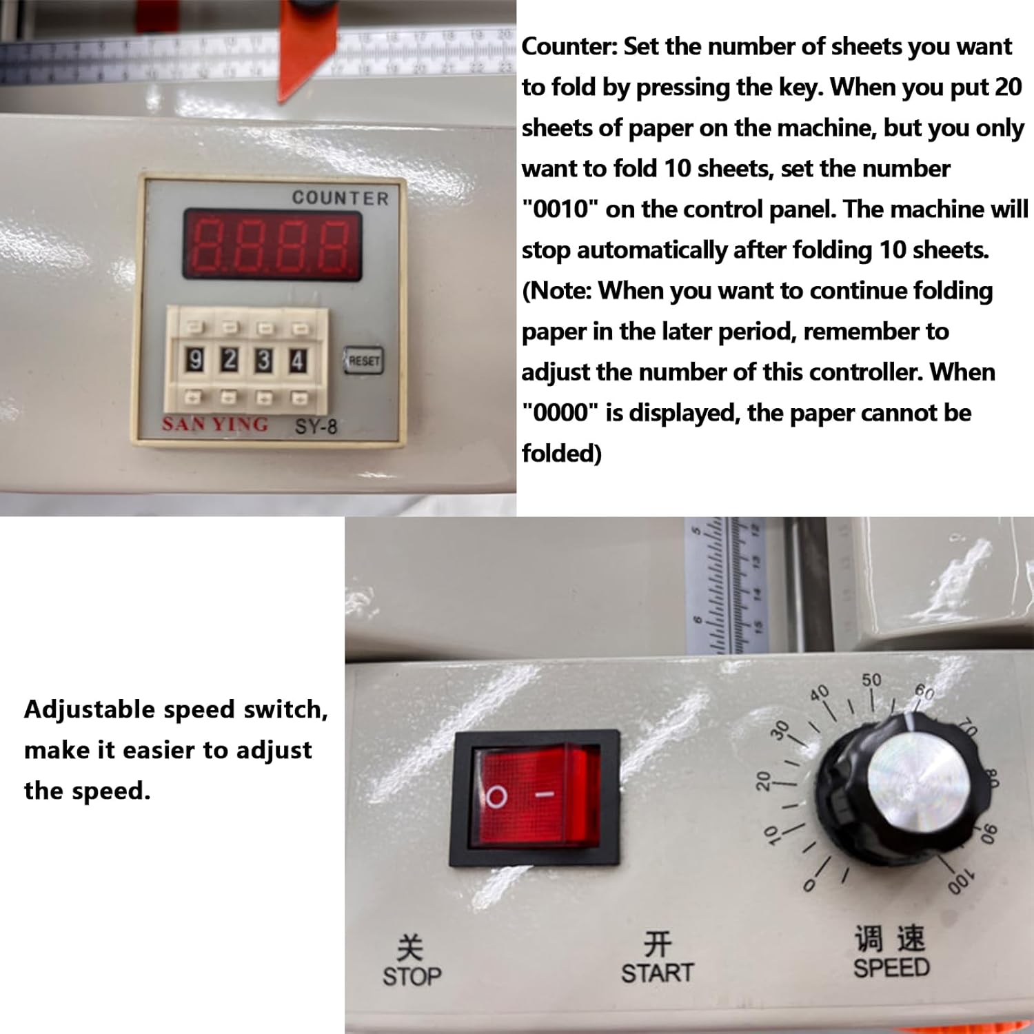 - Counting Function: Set the number of sheets you want to fold by pressing the key. When you put 20 sheets of paper on the machine, but you only want to fold 10 sheets, set the number "0010" on the control panel. The machine will stop automatically after folding 10 sheets.(Note: When you want to continue folding paper in the later period, remember to adjust the number of this controller. When "0000" is displayed, the paper cannot be folded)