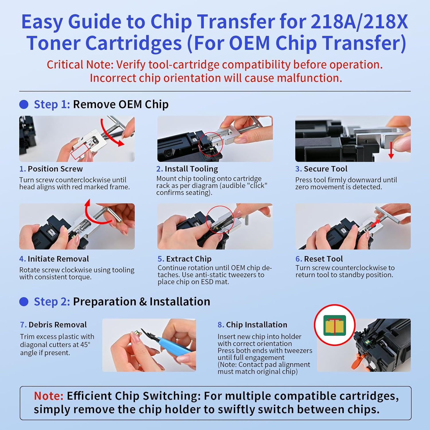- No Chip: These 218X toner cartridges do not have chips. Remove the chip from the old toner cartridge and install it on the new 218X toner. Refer to the provided user guide for detailed instructions