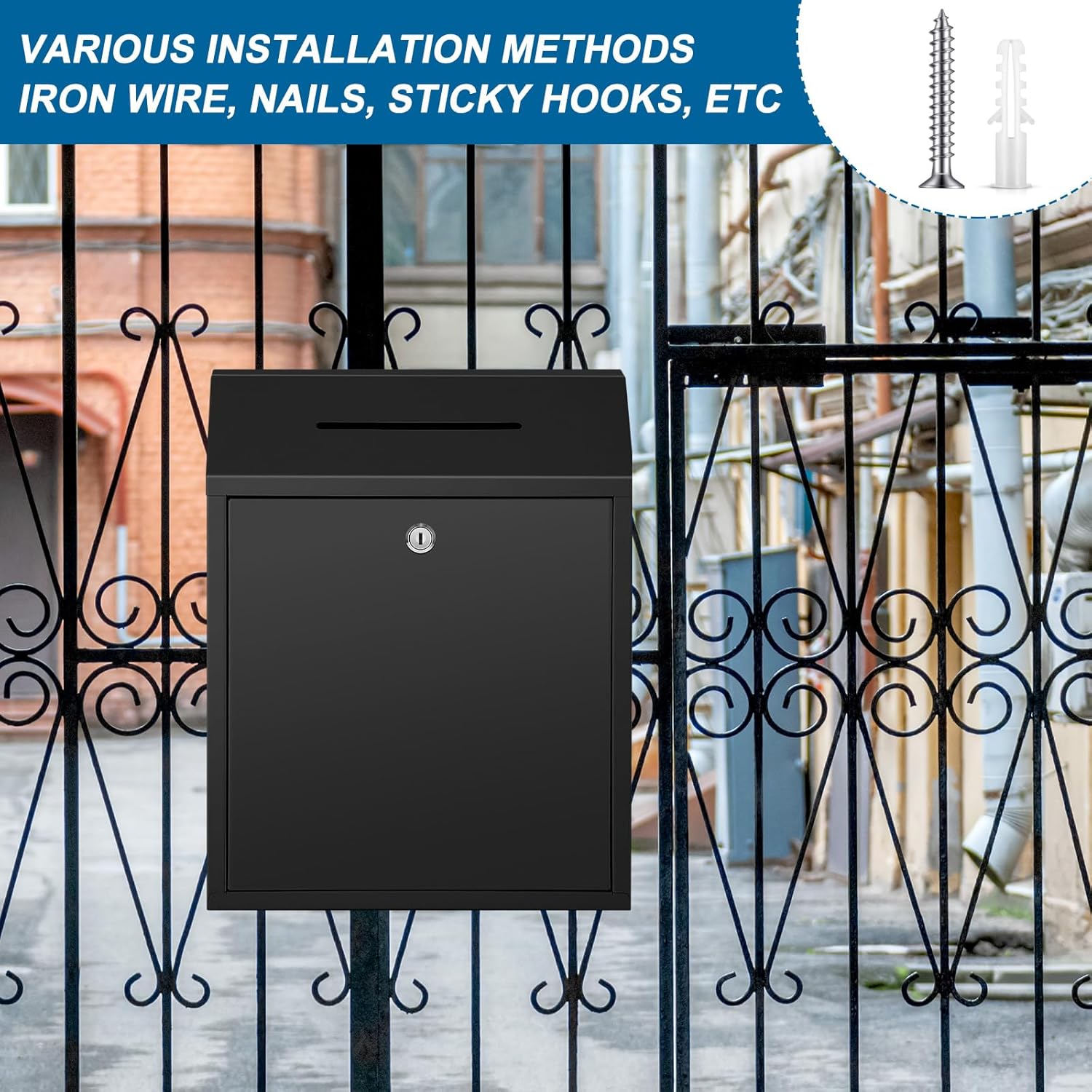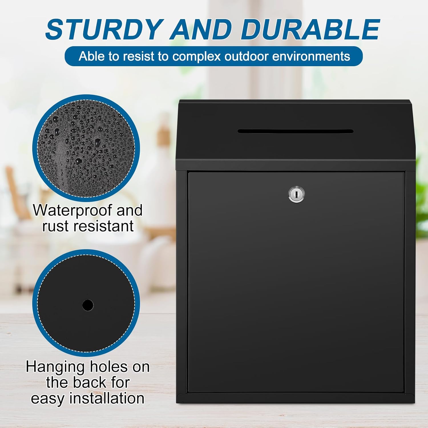 Metal Donation Cash Box Collection Safe Suggestion Box with Lock Wall Mounted Mailbox Delivery Ballot Container for Home Office Outdoor Door(Black,15 x 12 x 4 Inch)