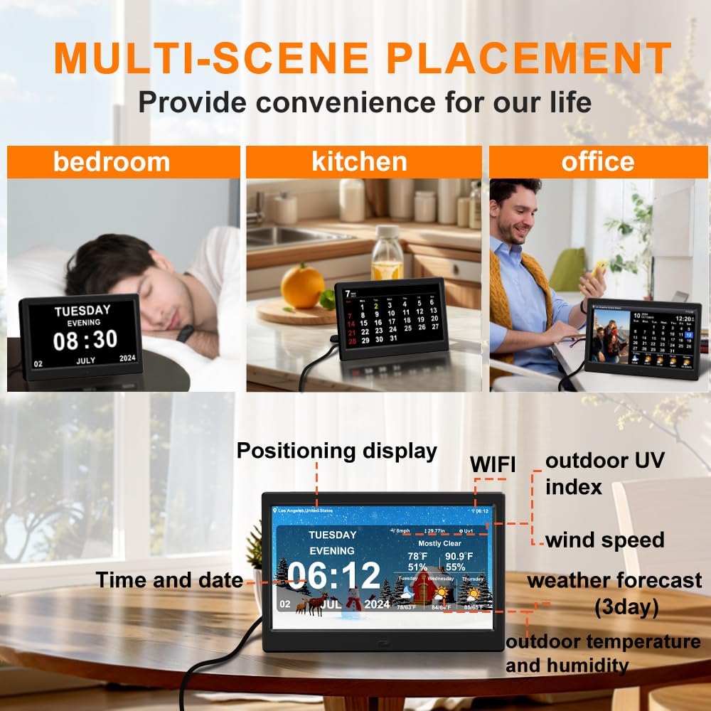 - γElderly Clockγ: It features an extra-large high-definition screen . The time, date, and day of the week are shown in large, non-abbreviated, andγ easy-to-read font, making it ideal for seniorsγ. Additionally, it includes 8 icon-based alarm groups for activities such as taking medication, exercising, and waking up. When an alarm goes on, the corresponding icon is displayed to remind you of the current activity. it has a voice time announcement feature that announces the time every hour