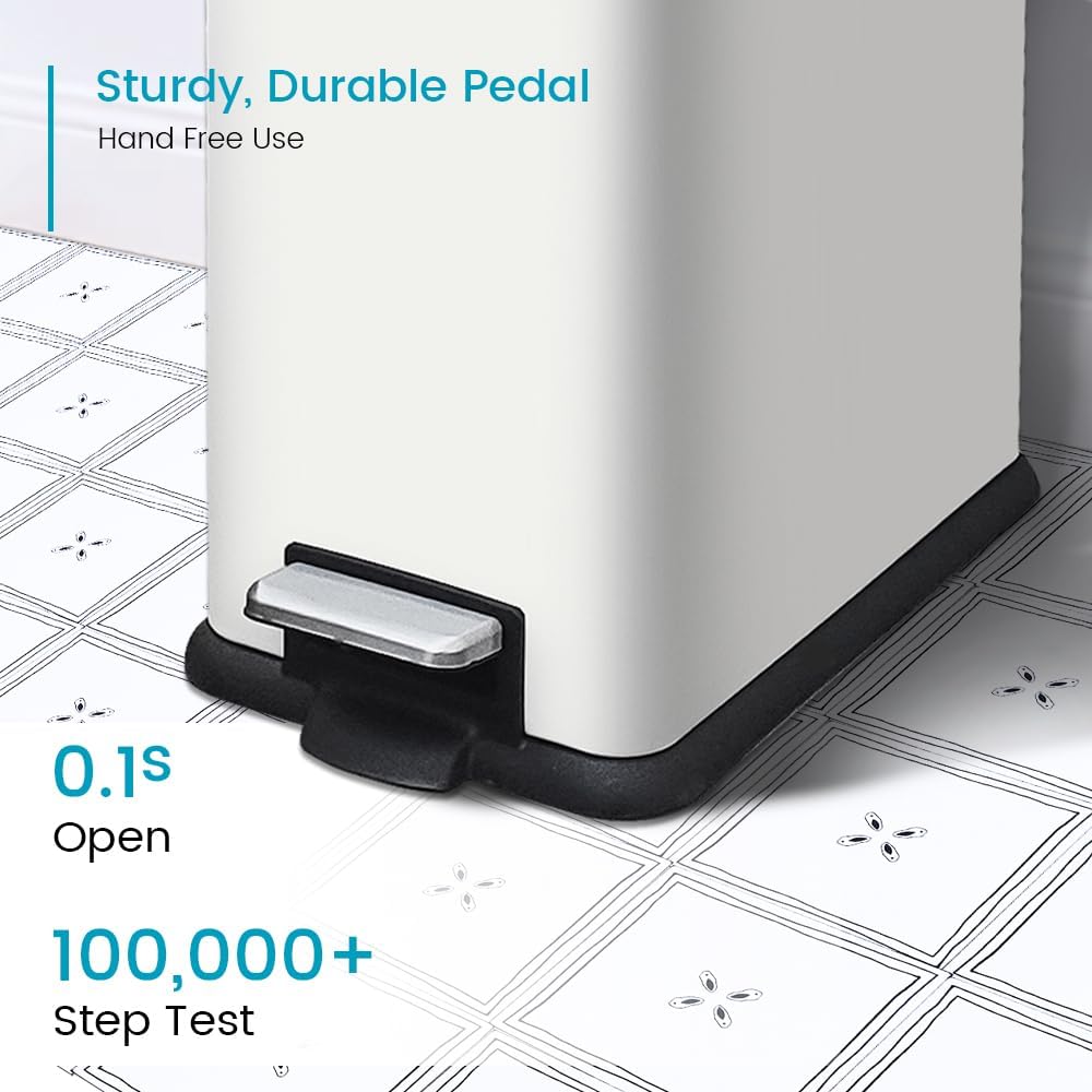 - Duable Stainless Steel: Our slim kitchen trash can with lid is made of Stainless Steel, thick and durable, and anti-fingerprint&Rust. and makes cleaning a breeze! A white finish with a sleek modern look that easily matches any decor.