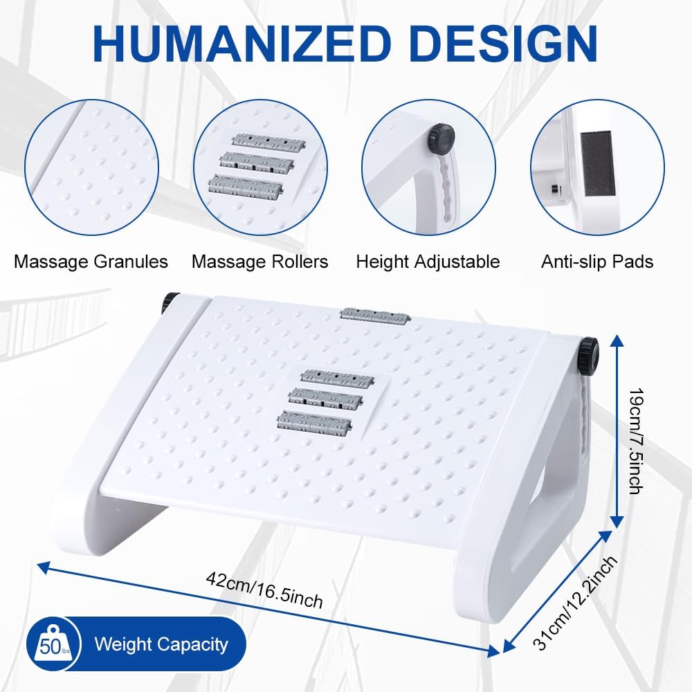 Foot Rest for Under Desk At Work - Six Heights Adjustable Under Desk Footrest - Ergonomic Foot Stools for Under Office Desks - Desks Foot Rest with Massage Rollers - Leg Rest for Chair (White)