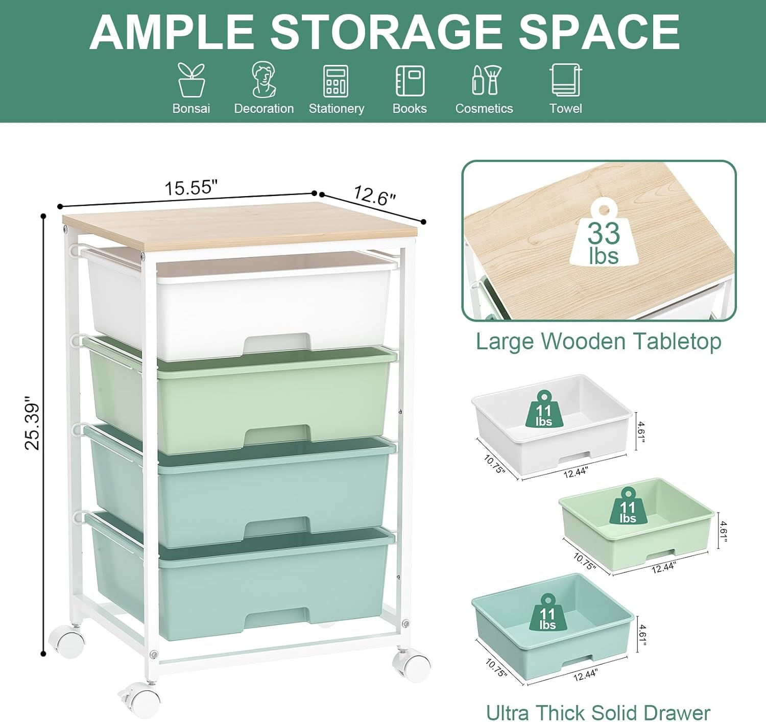 - AMPLE SPACE FOR STORAGE & CLASSIFICATION: The overall size of this storage cart with drawers is 15.55"D x 12.60"W x 25.39"H. Wooden tabletable top allows you to put plants, paper cutting printer,printer and other decorations. By expanding the storage space vertically design,there are different color drawers for to store and classifying your stuff.
