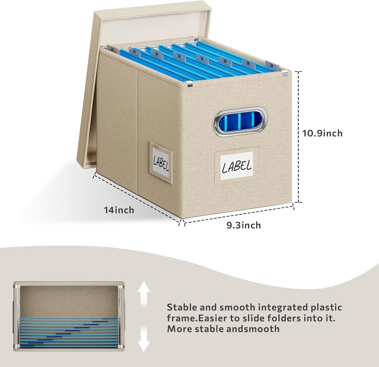 File Organizer Box with Lid - Set of 2 Portable Hanging filebox, Collapsible Linen Decorative Filing Storage Boxes for Office & Home File Cabinet (Beige 14 x 9.3 x 10.9 inch)