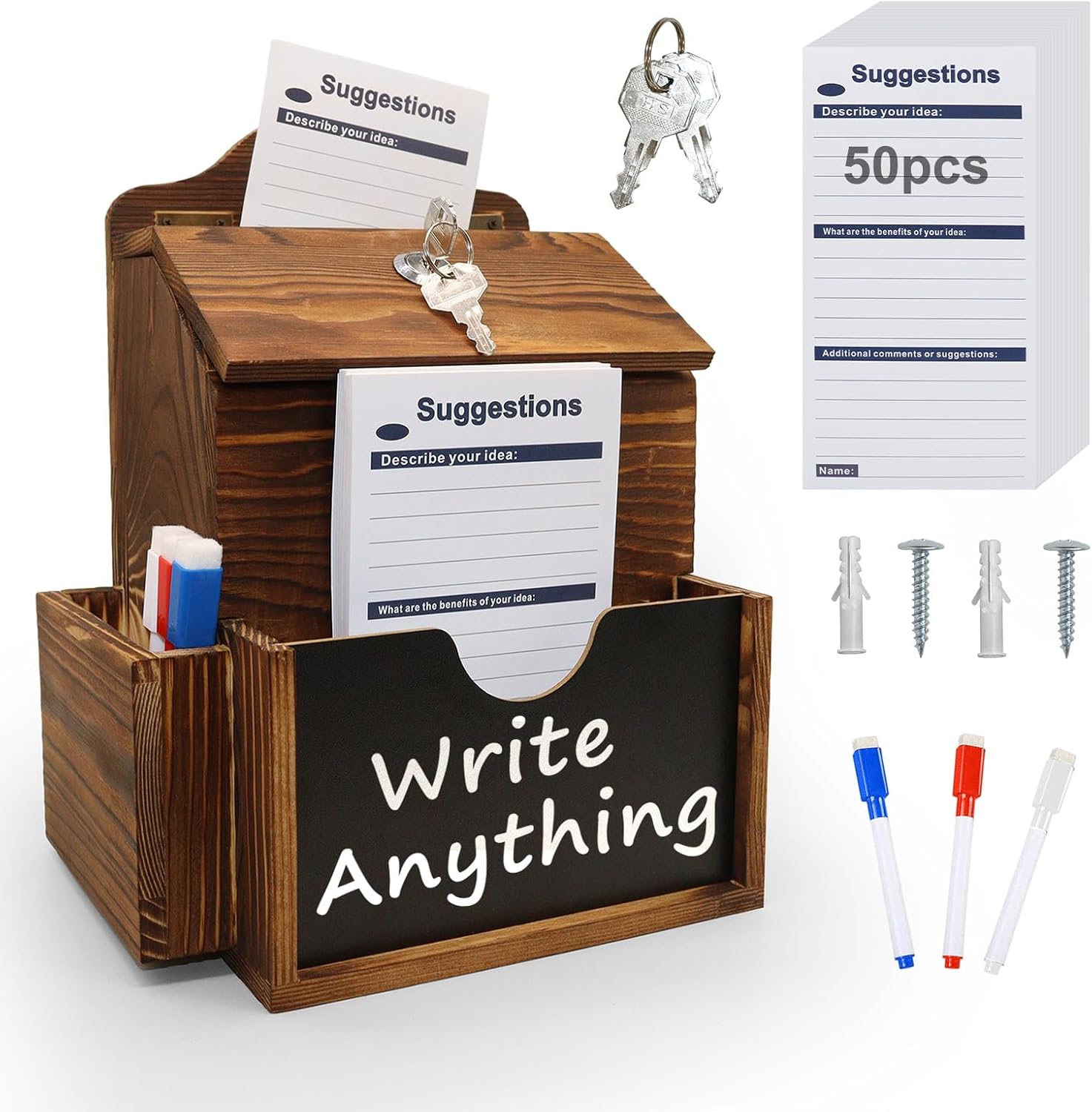 - 【DOUBLE-SIDED CHALKBOARD】The double-sided detachable chalkboard is designed for suggestion box to effectively communicate its mission. Use the three included colored chalkboard pens(red, blue, white) to clearly write down the donation box' s purpose and themes. This versatile chalkboard enhances engagement and helps convey important information with ease