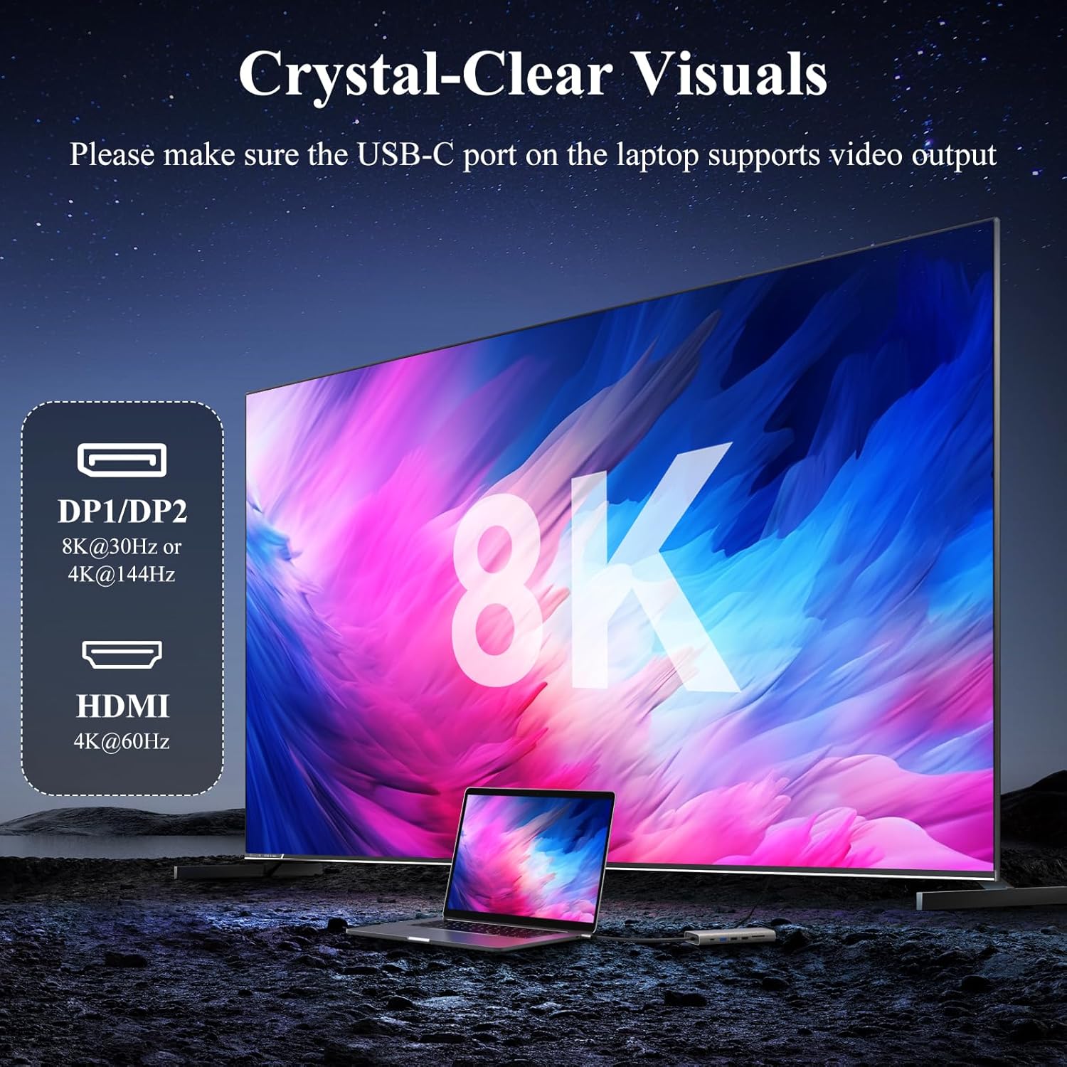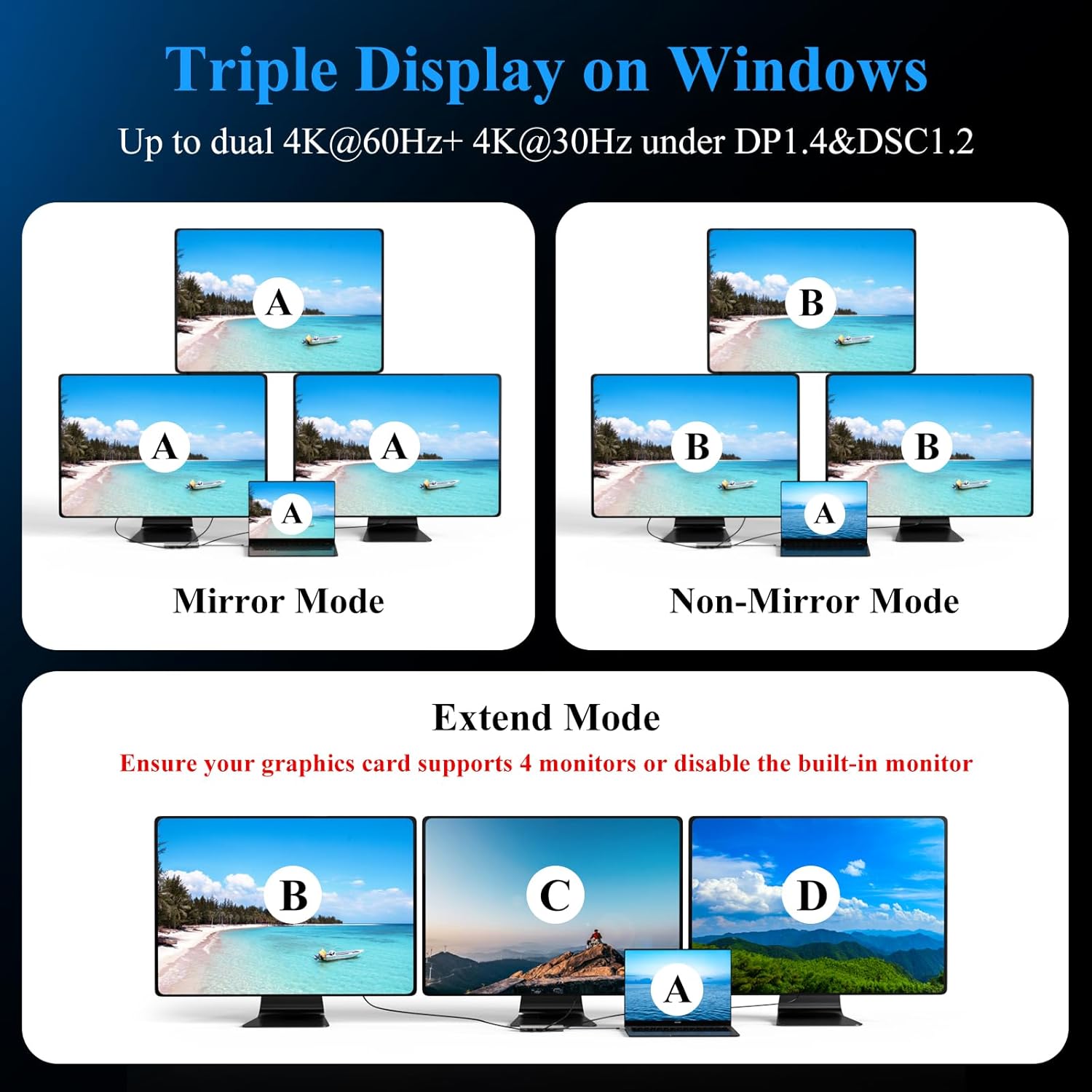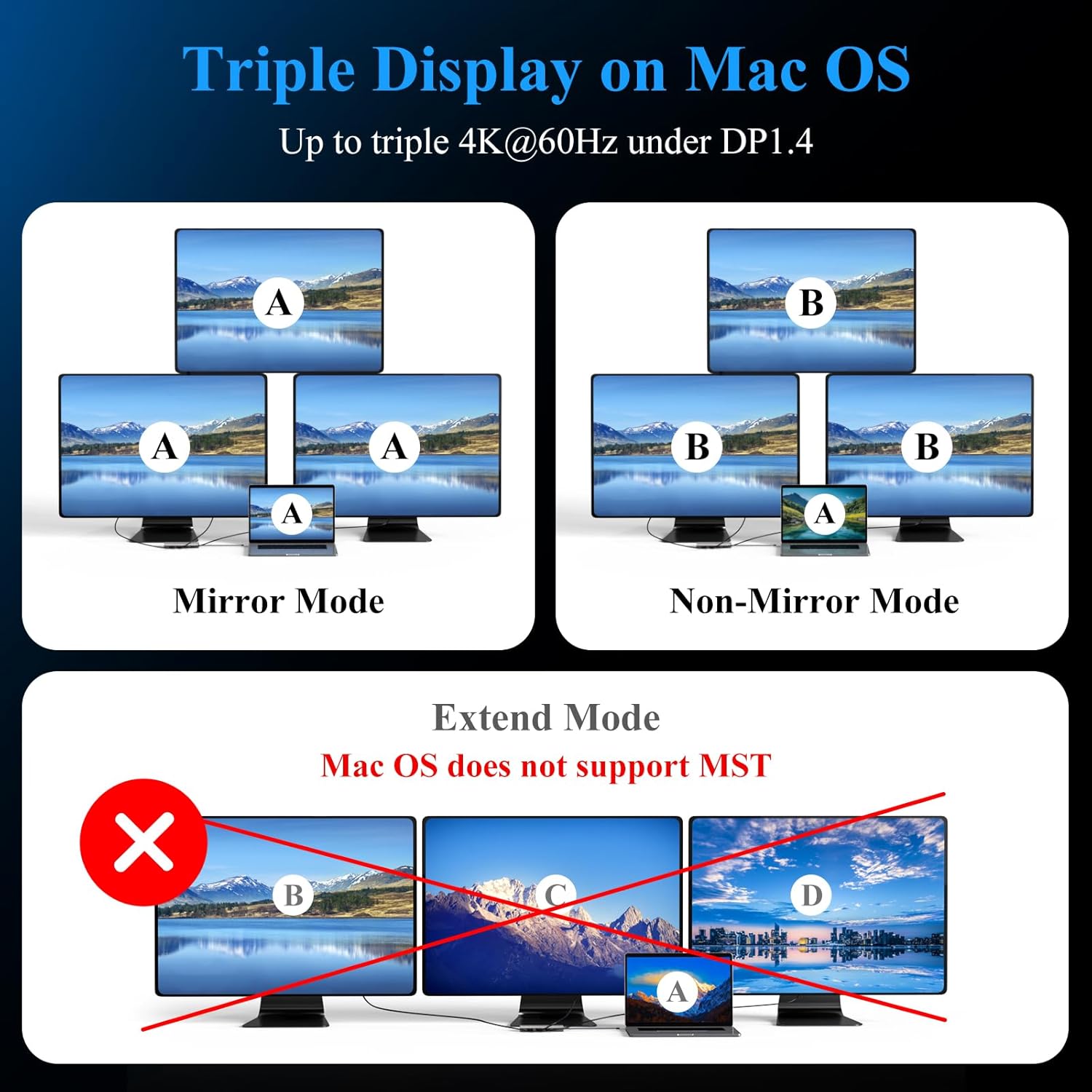 - β Docking Station 3 Monitors: Laptop Docking Station DP*2 8K 144HZ & HDMI 4K 60HZ, docking station dual monitor dual monitor for visual creators and gamers, usb c dock delivers ultra HD images with triple 4K (under DP1.4 & DSC1.2) through HDMI and DP1/DP2 ports,Ensure your laptop's USB-C port supports video output. Note: Multi-Stream Transport (MST) is not supported on Mac laptops. Displays connected via HDMI/DP/VGA (if those video ports are available) will mirror the same image