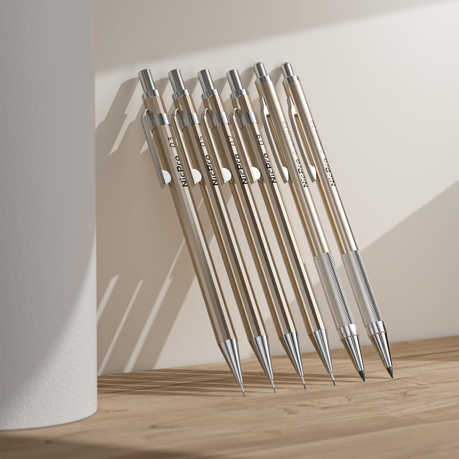 - 1. Awesome Artist Set 33PCS:Nicpro drawing mechanical pencil set comes with 6pcs metal mechanical pencils in 0.3mm,0.5mm, 0.7mm, 0.9mm and 2.0 mm , each sized a different line width for a variety of sketching techniques. 4B soft erasers and mini cap eraser refills are included,cleanly and completely removes graphite markings from paper